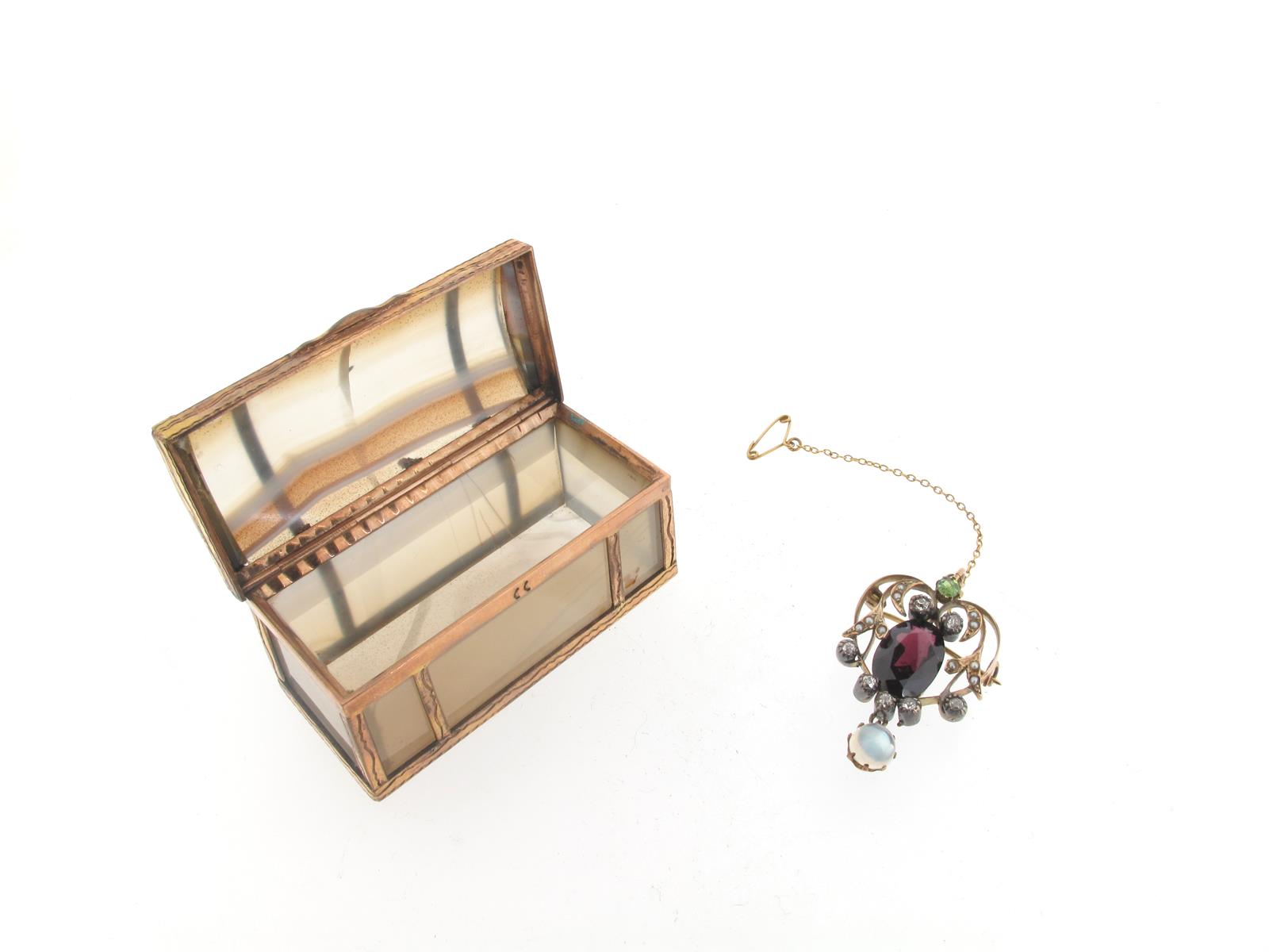 An Edwardian gem-set gold brooch pendant, set with a large oval-shaped garnet within scrolling border set with diamonds, a peridot and suspending a moonstone. 3.5cm long, with a 19th century agate box, with domed lid and gilt metal mounts