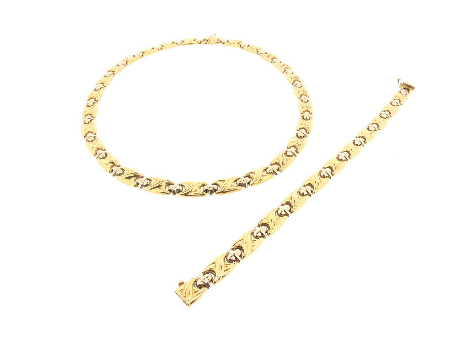 A fancy-link collar necklace, in bi-colour gold with a matching gold bracelet, 45g, necklace 41cm long, bracelet 18.5cm long