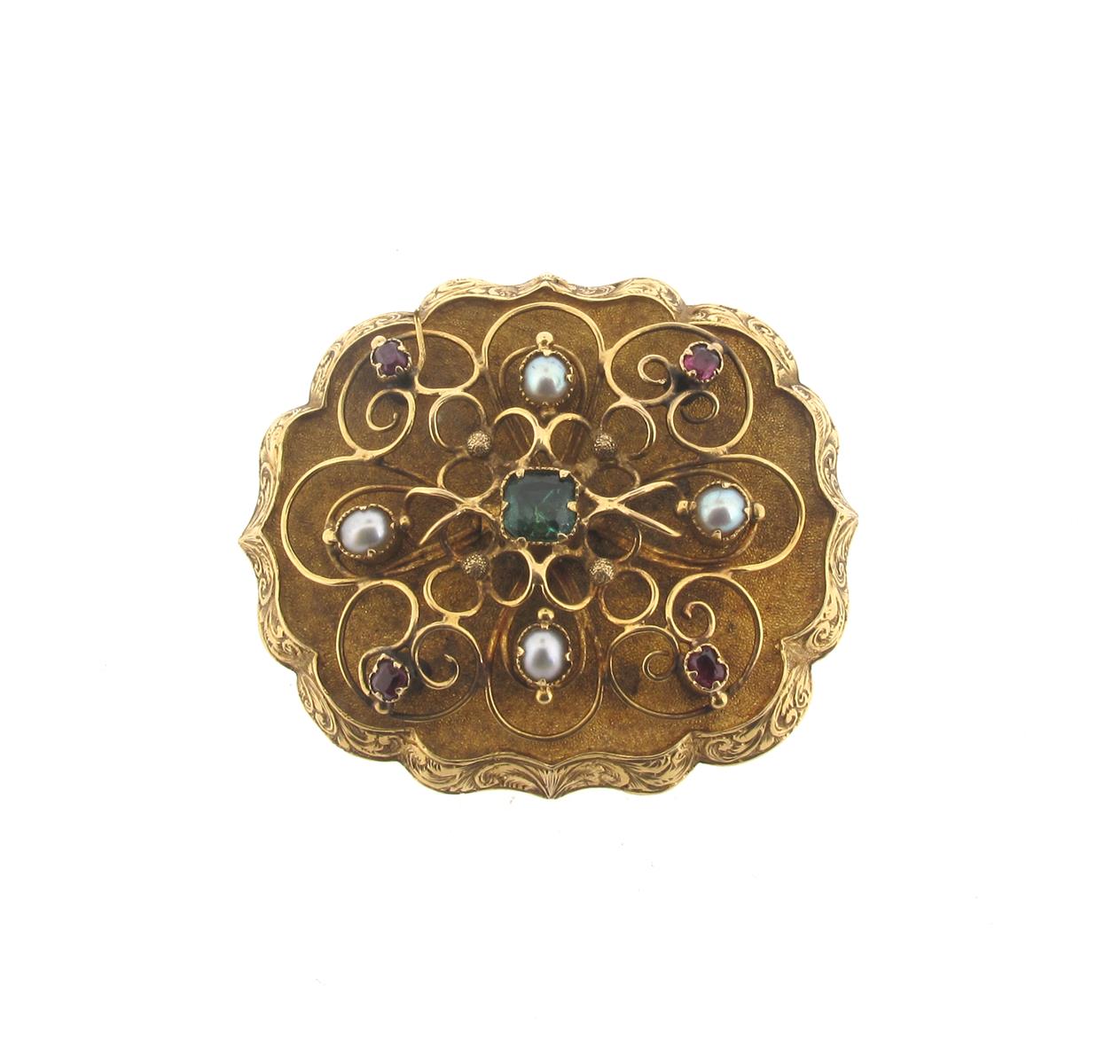 A late Victorian gold brooch, set within chased border and scroll decoration set with seed pearls rubies and an emerald, with glazed locket compartment to reverse containing plaited hair, 4cm long
