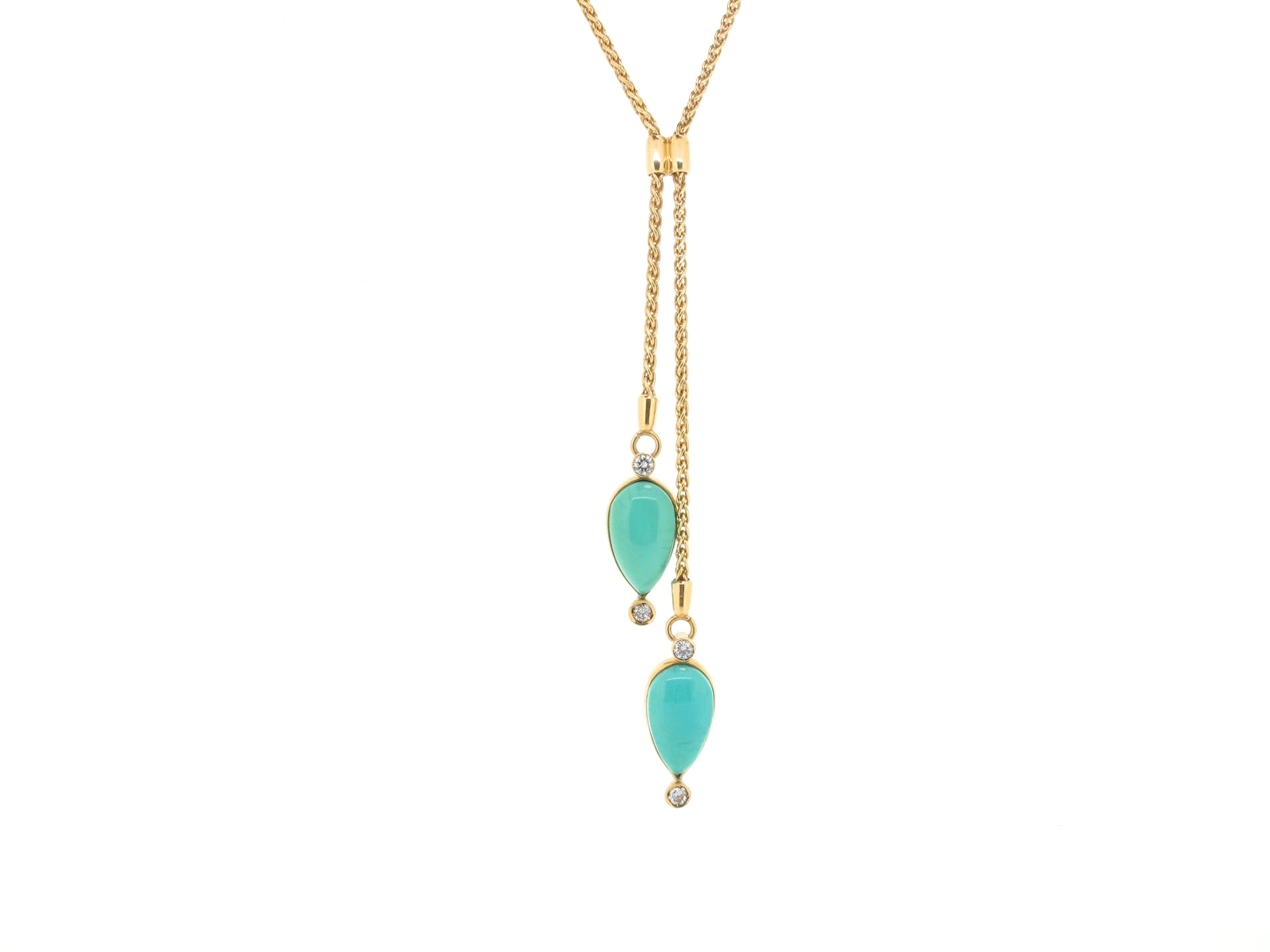 A turquoise and diamond necklace, the fancy-link long chain suspends two pear-shaped turquoise drops with diamond terminals in yellow gold, the necklace can be adjusted so that the turquoise pendants can be worn at varying heights, 66cm long, 30g total