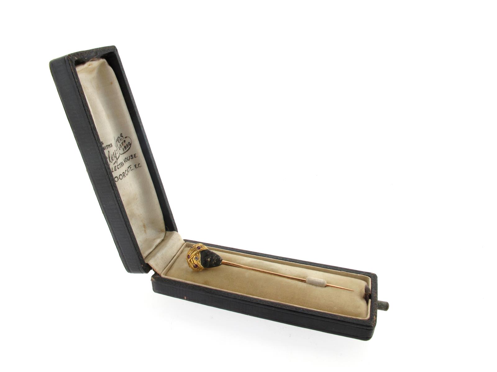 A gold blackamoor stick pin, realistically designed with a gold turban set with rubies and diamonds, case