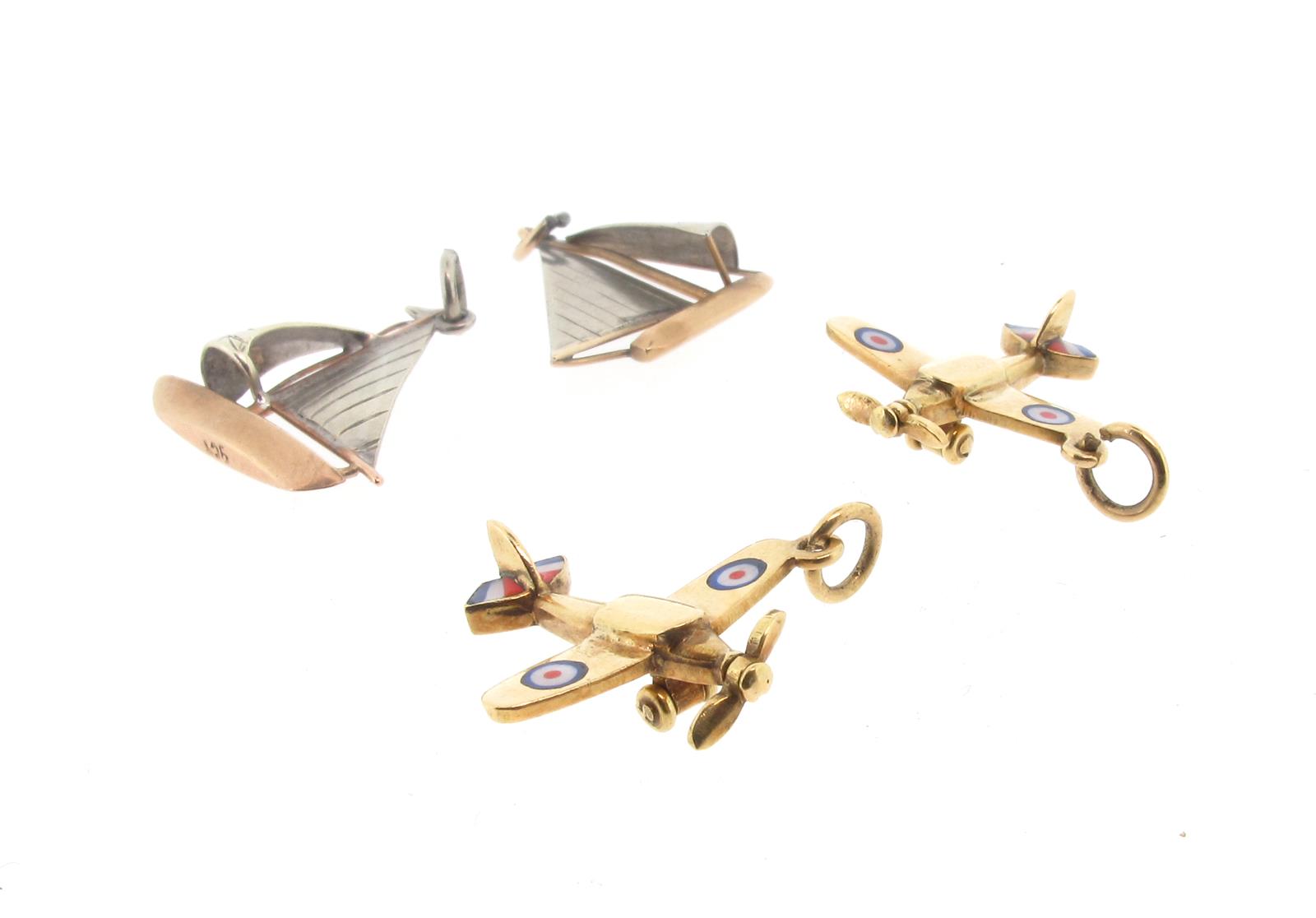Two gold spitfire charms decorated with polychrome enamel , with two gold sail boat charms