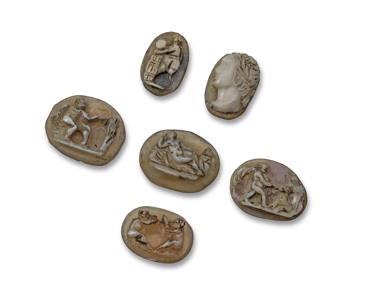 Six small assorted carved hardstone Renaissance cameos, depicting various Classical scenes and a profile portrait, varying sizes from 1cm high - 1.3cm wide largest