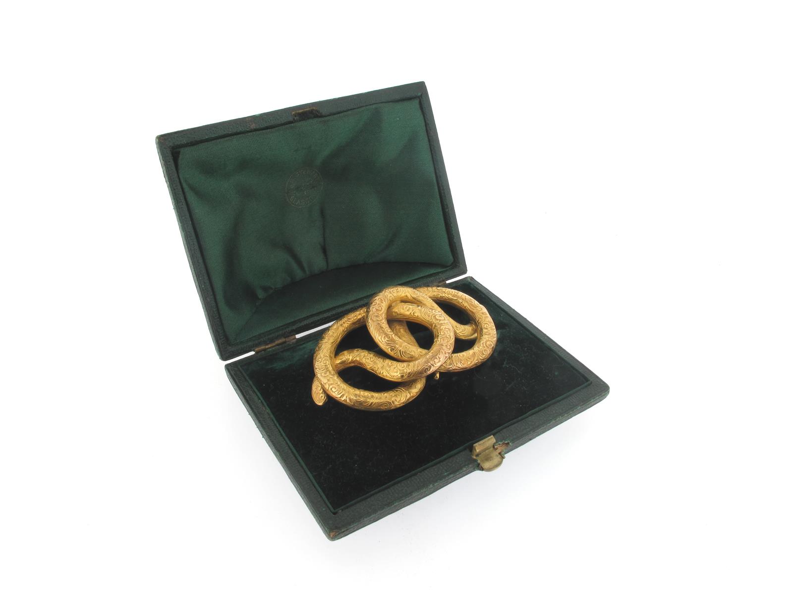A late Victorian gold scroll brooch, with foliate engraved decoration, 7cm wide, 14g, fitted case