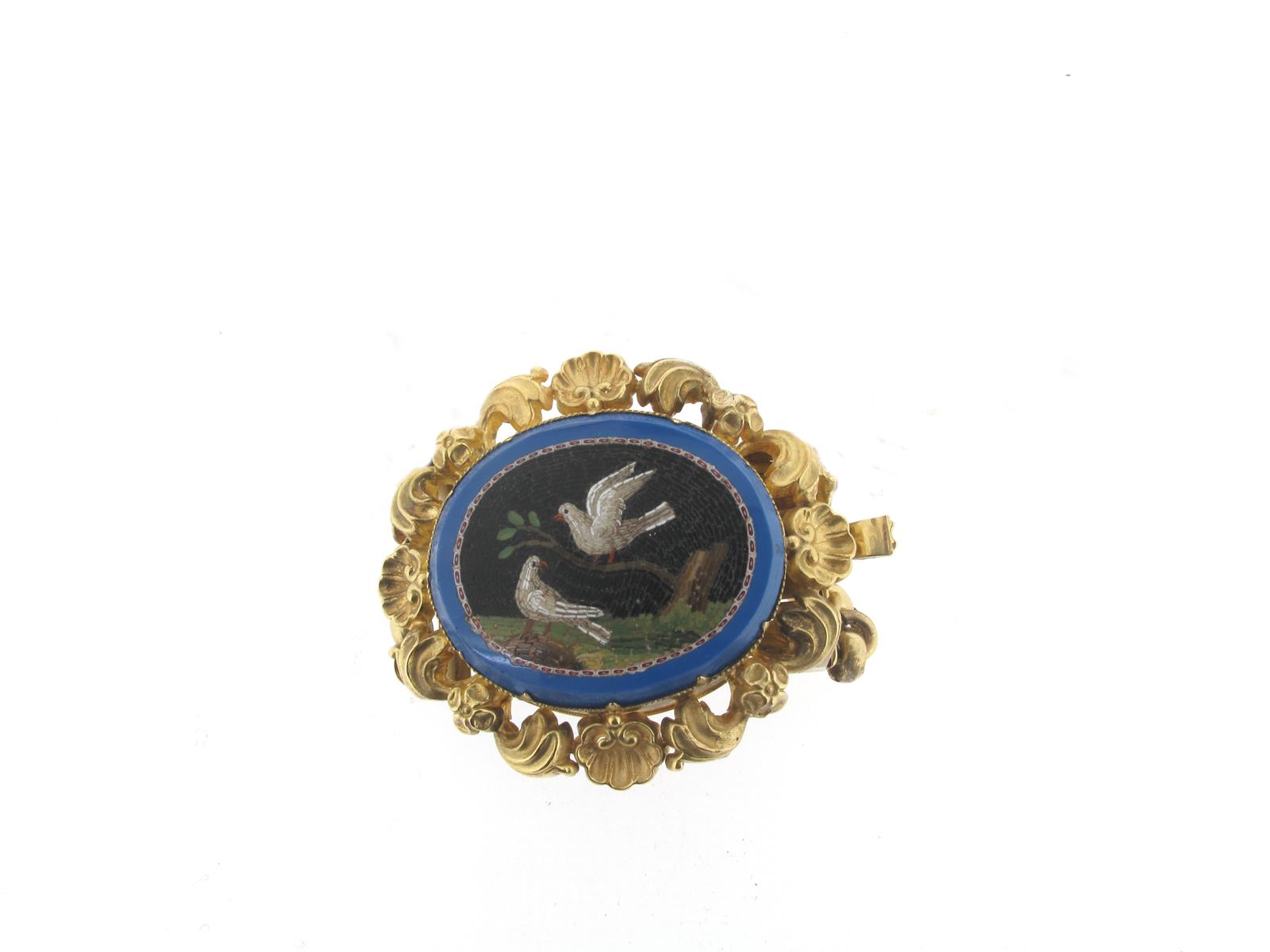 An early 19th century gold-mounted micromosaic plaque, depicting two doves within a gold foliate shell border mounted as the centrepiece for a bracelet with two gold chains and clasp, micromosaic 2.8cm wide