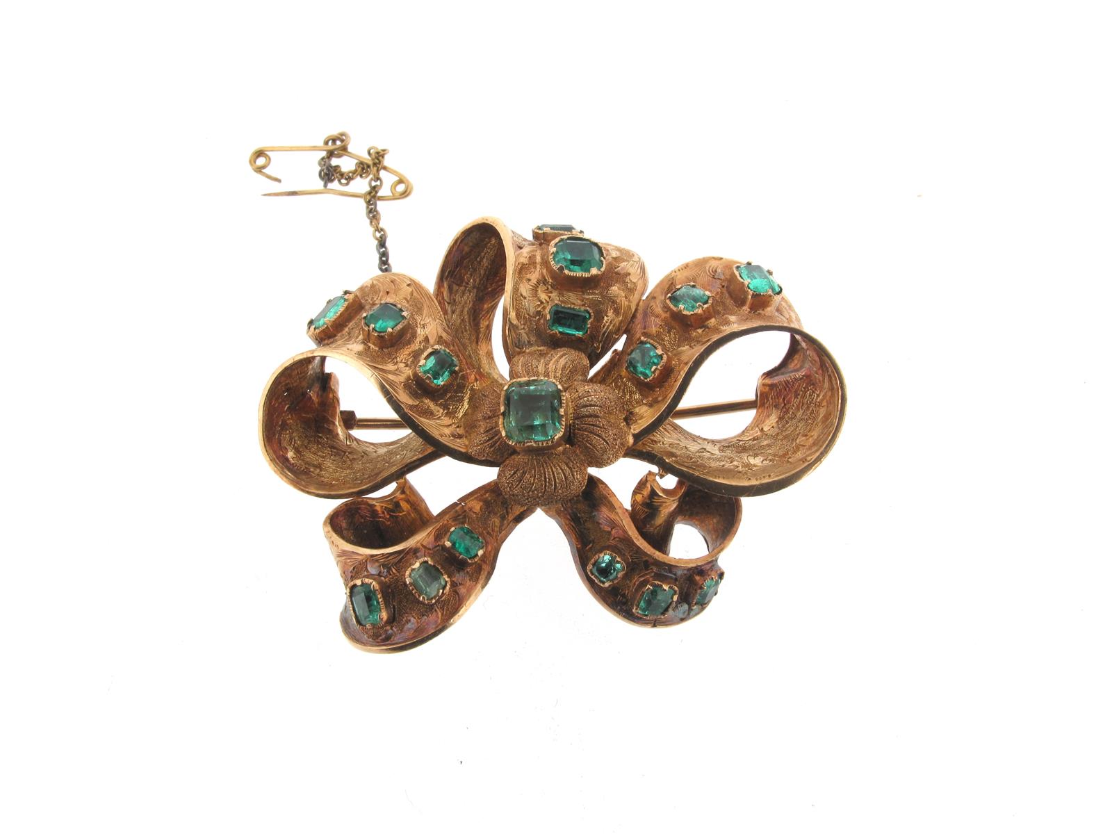 A Victorian emerald-set gold bow brooch, of carved foliate design, 5cm wide