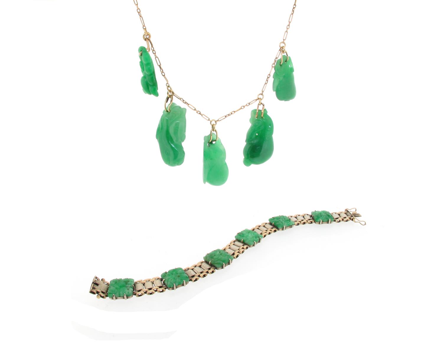 A fine-link gold necklace mounted with five carved jade pendants and six gold beads, 40cm long, with a fancy-link gold bracelet set with six carved jade panels, 17.7cm long