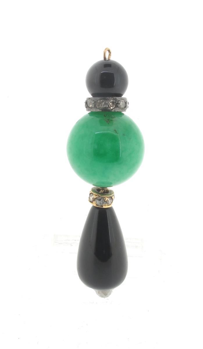 A jade, onyx and diamond pendant, centred with a spherical jade bead between two rose-cut diamond-set gold discs and suspending a drop-shaped black onyx bead, with a further rose-cut diamond bead to the base, with yellow gold fine-link chain, 5cm