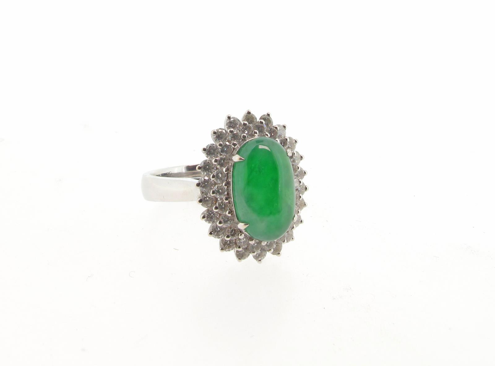 A jade and diamond cluster ring, the oval jade cabochon set within a surround of graduated round brilliant-cut diamonds, size M ½