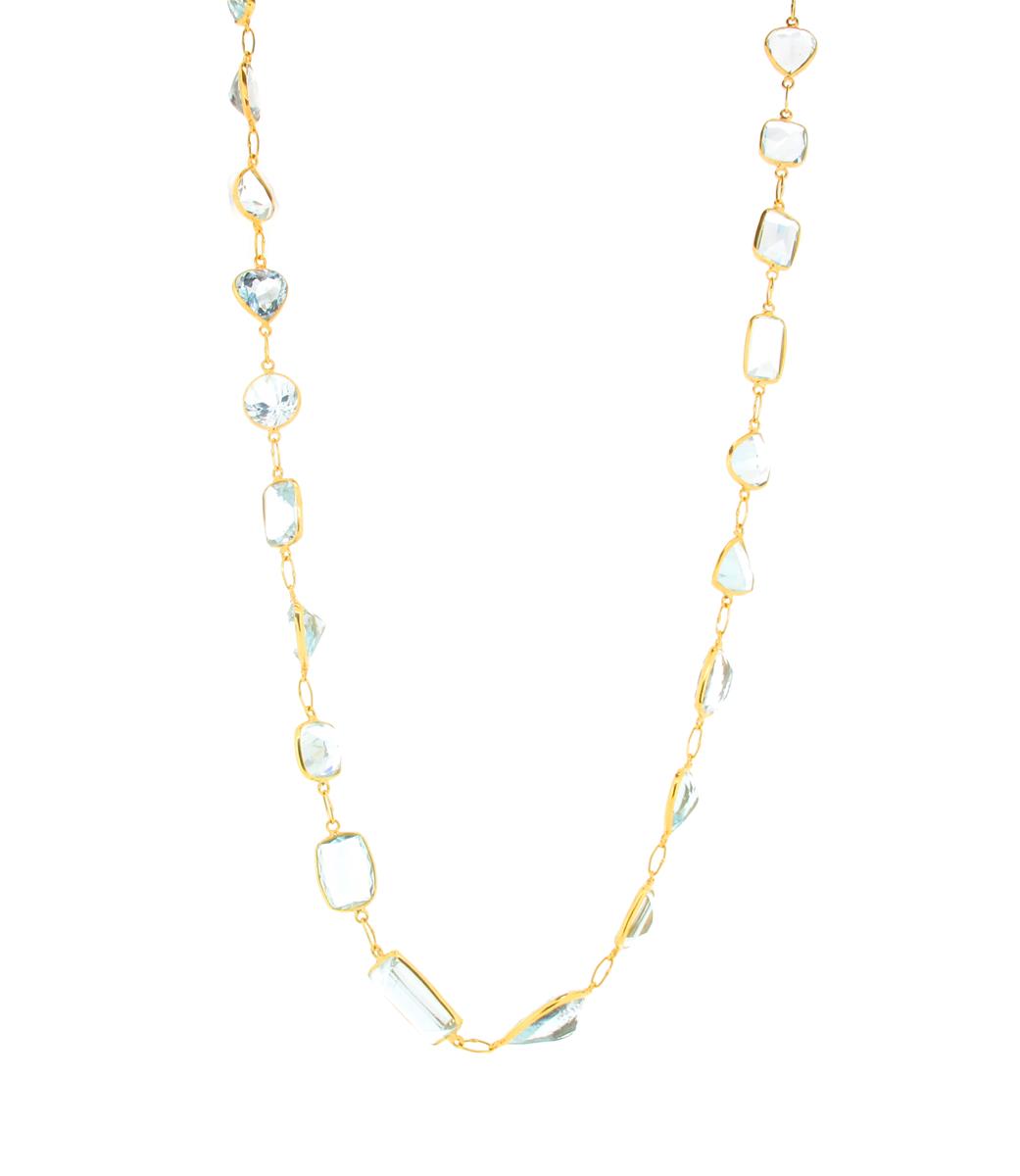 An aquamarine necklace, the round brilliant, pear, cushion, emerald and triangular-shaped aquamarines and set in yellow gold spectacle mounts, 52cm long