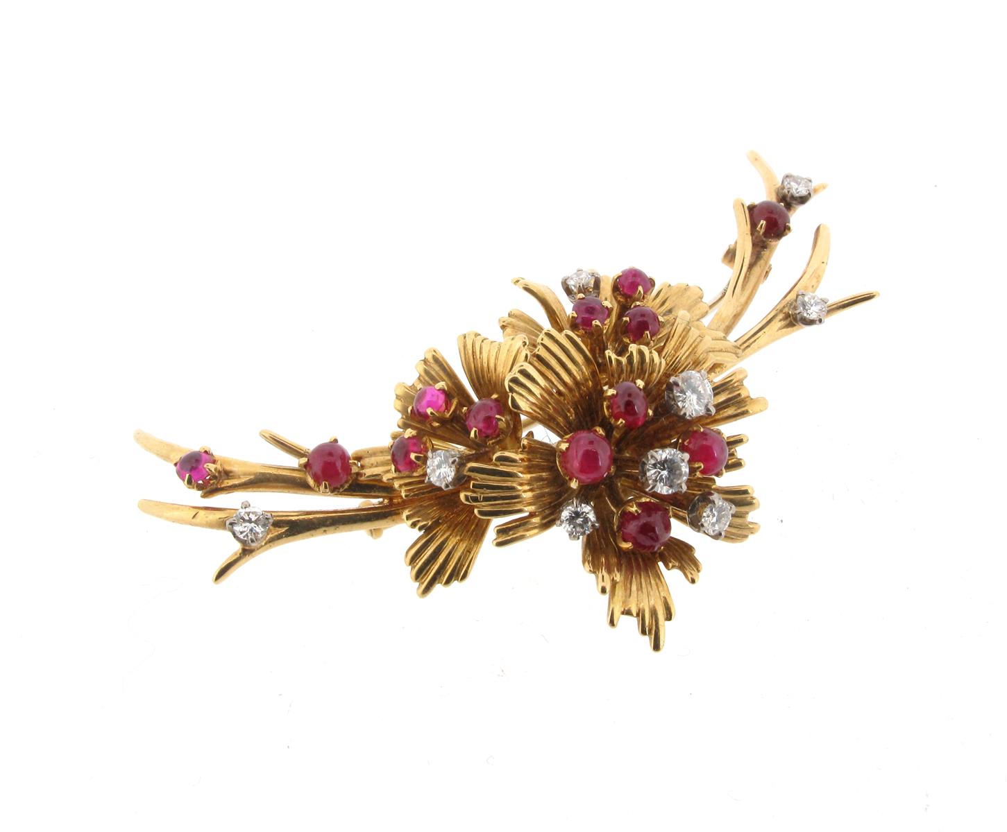 A ruby and diamond foliate brooch, set in yellow gold with cabochon rubies and circular-cut diamonds, 7cm long