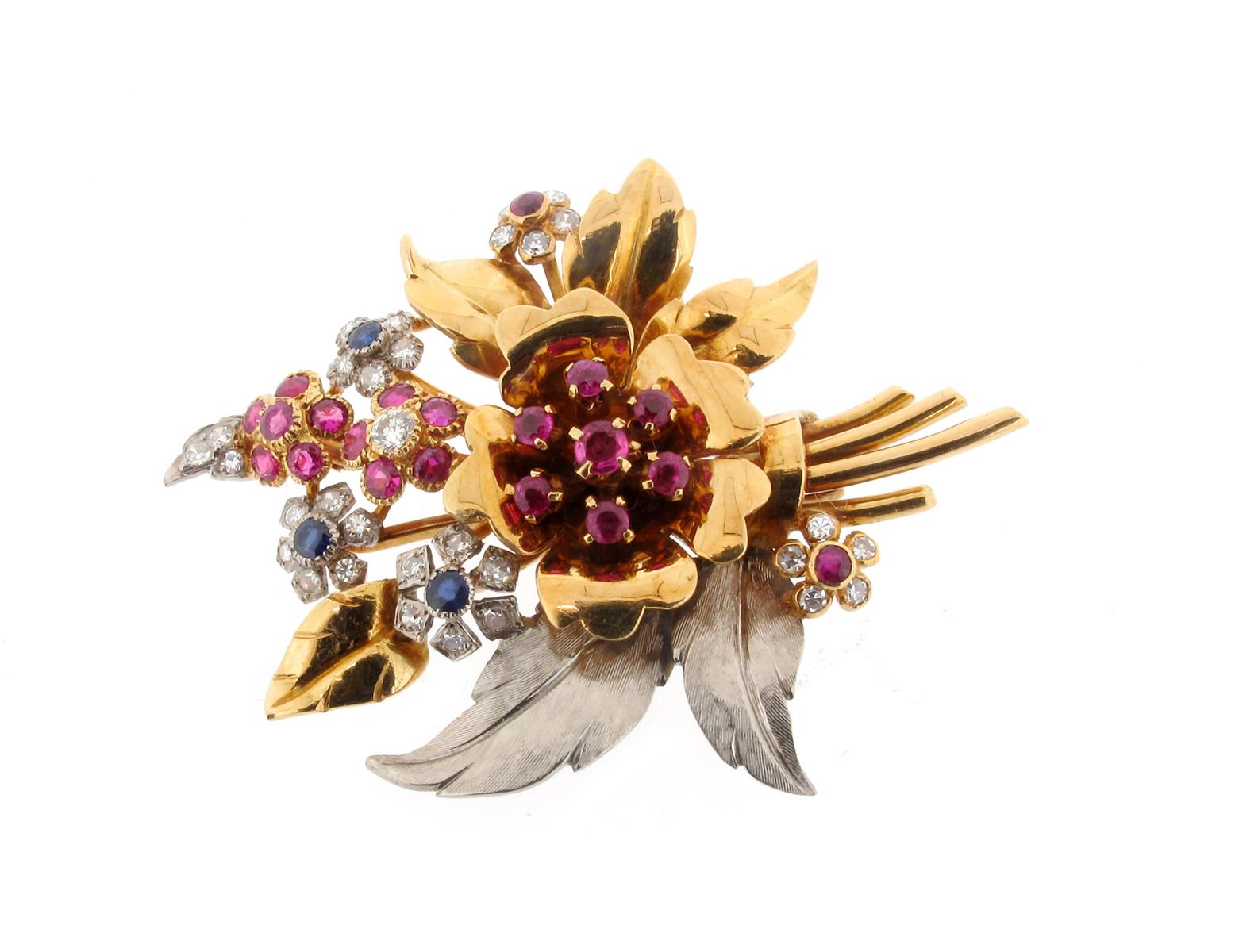A gem-set floral brooch, set with rubies, diamonds and sapphires with yellow and white gold leaves, 5cm