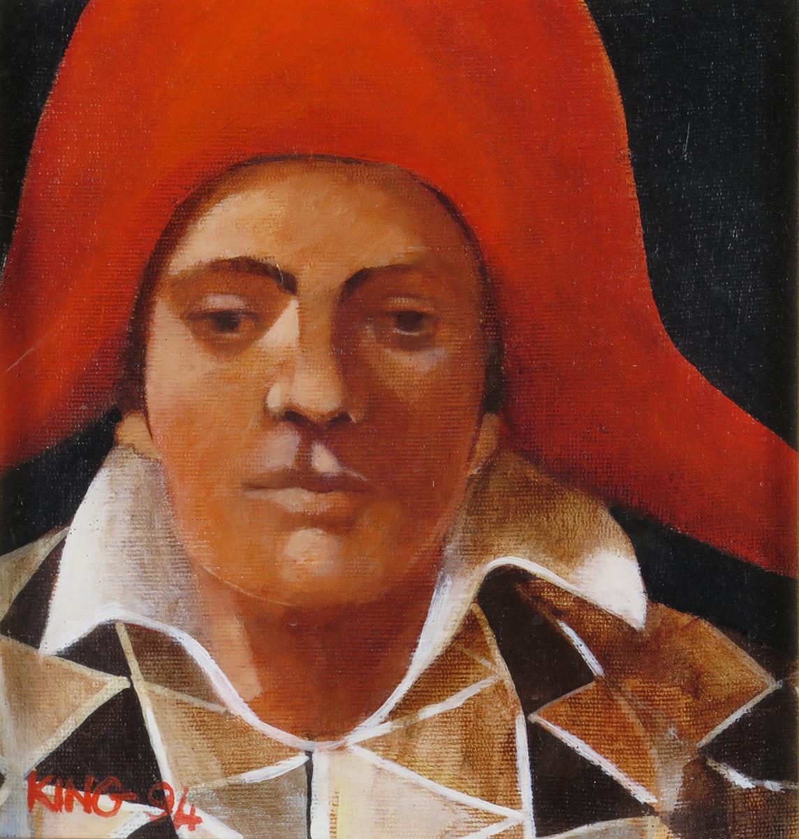 ‡Alan King (Scottish 1946-2013) Pensive Jester Signed and dated 94 Oil on board 18 x 17cm...