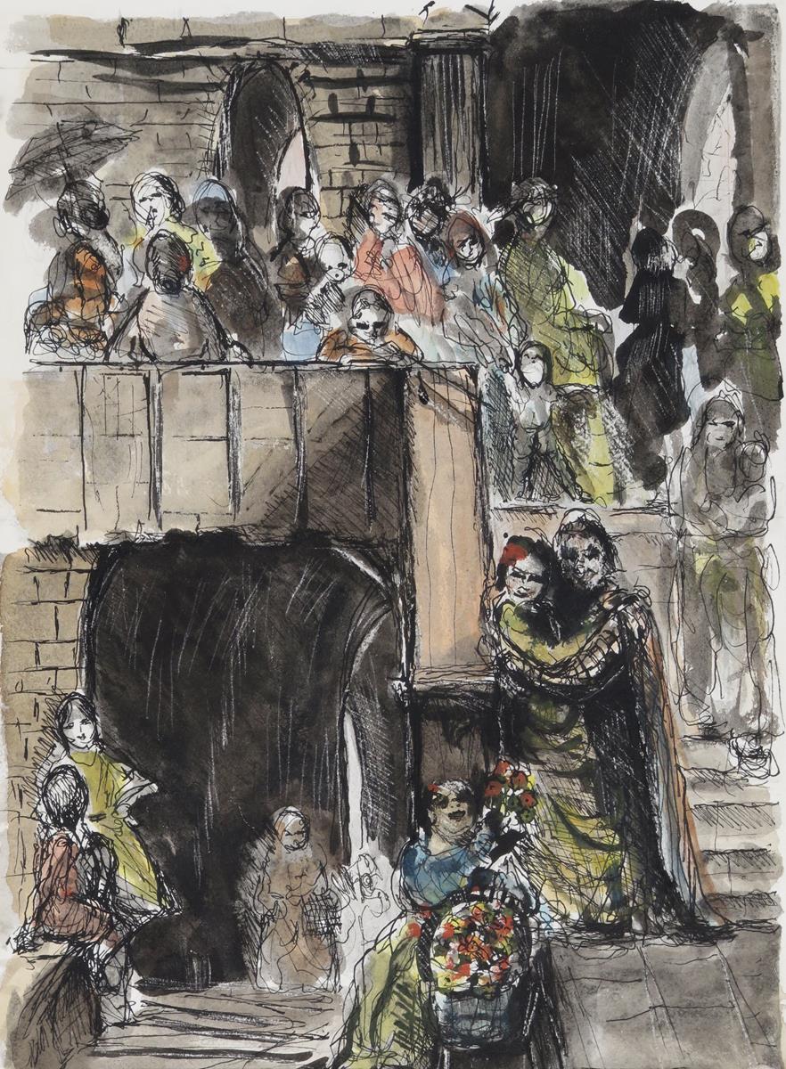 ‡Feliks Topolski RA (1907-1989) Figures on the castle stairs Pen