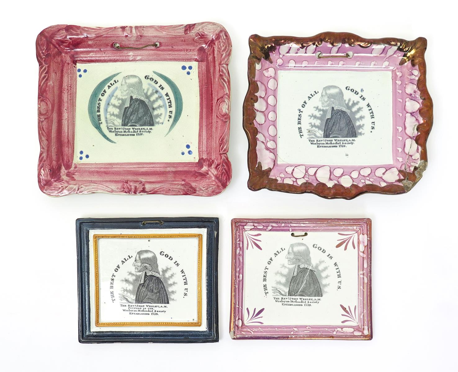 Four pearlware plaques relating to Methodism and John Wesley 19th century, all printed in black with a profile portrait of the minister with 'The Best of All' to one side and 'God is With Us' the other, titled beneath the print, within Sunderland lustre, black and Portobello type red moulded borders, some damages, 23cm max. (4)
