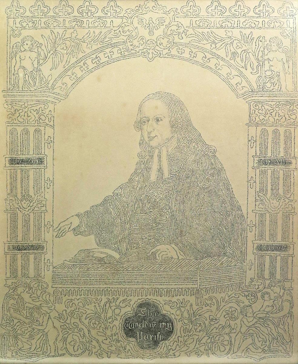 A rare biographical script portrait of John Wesley c.1885, printed after Glück Rosenthal, the portrait drawn using a continuous calligraphic script of his life taken from Richard Watson's 1831 biography, together with a printed transcript and six other prints relating to Wesley and Methodism. (7)