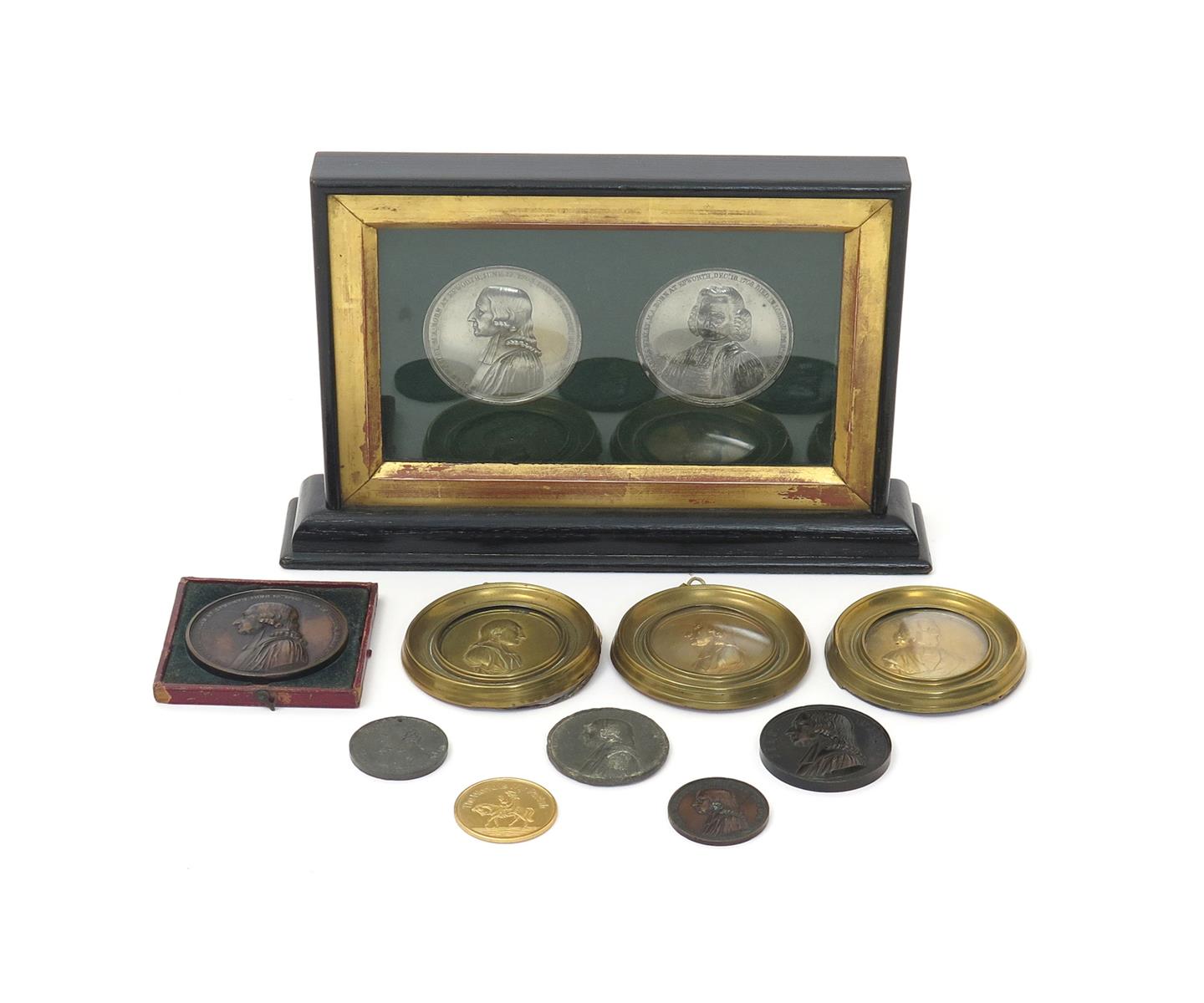 A group of commemorative medals relating to John Wesley and Methodism 19th century and later, two white metal and relating to the centenary of Methodism in 1839 and bearing portraits of John Wesley and Charles Wesley, mounted in a glazed free-standing frame, an 1830 medal of Robert Raikes, and unframed 1839 medal of John Wesley, three further 1839 bronze medals (one boxed), and three small framed plaques of John and Charles Wesley. (10)