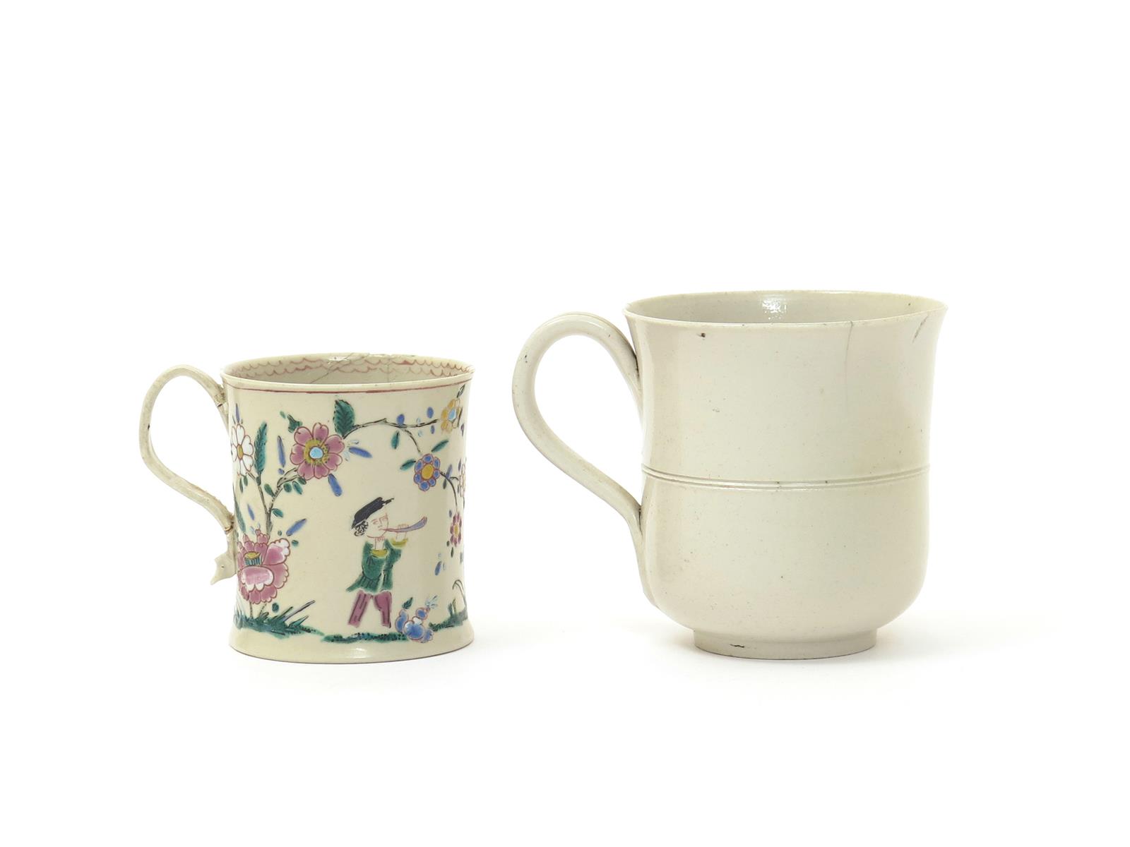 A small salt-glazed stoneware mug or coffee can c.1745, the slightly waisted cylindrical form painted in polychrome enamels with a figure blowing a horn beneath large flowering plants, and a salt-glazed stoneware coffee cup left in the white with a grooved handle, some damages, 7cm max. (2)