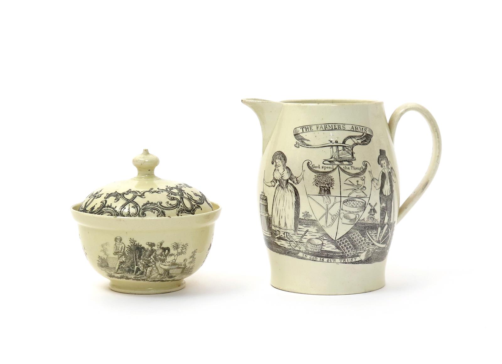 A creamware sucrier and cover c.1760-70, printed in Liverpool by John Sadler with Pierrot creeping up on Harlequin and Columbine, the reverse with sheep grazing, the cover with a continuous scrolling foliate design, and a creamware jug printed in black with The Farmers Arms, the reverse with a print of a twelve line poem within a cartouche of farming attributes, signed and dated TW 1760 in the print, 12.8cm max. (3)