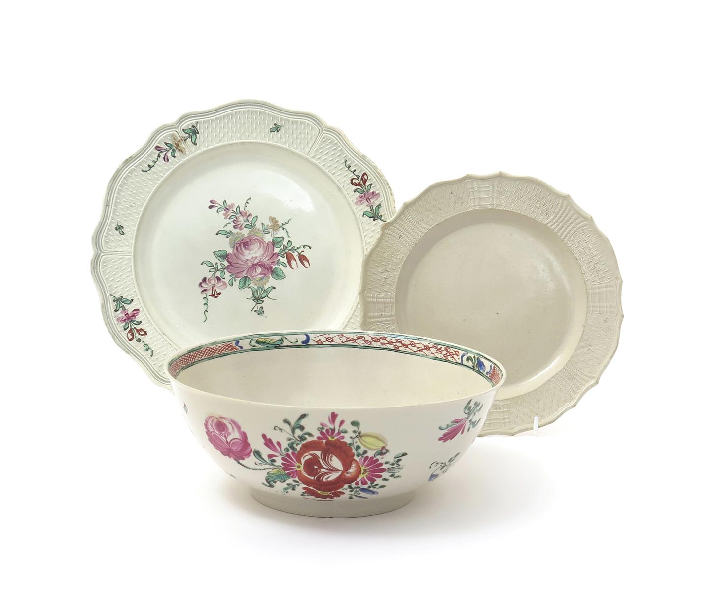 Two salt-glazed stoneware plates c.1750, the shaped rims moulded with seeded and osier panels, the larger plate painted with flower sprays in polychrome enamels, and a salt-glazed stoneware punchbowl painted with bold flower sprays, the interior with a panelled diaper border, 25cm max. (3)