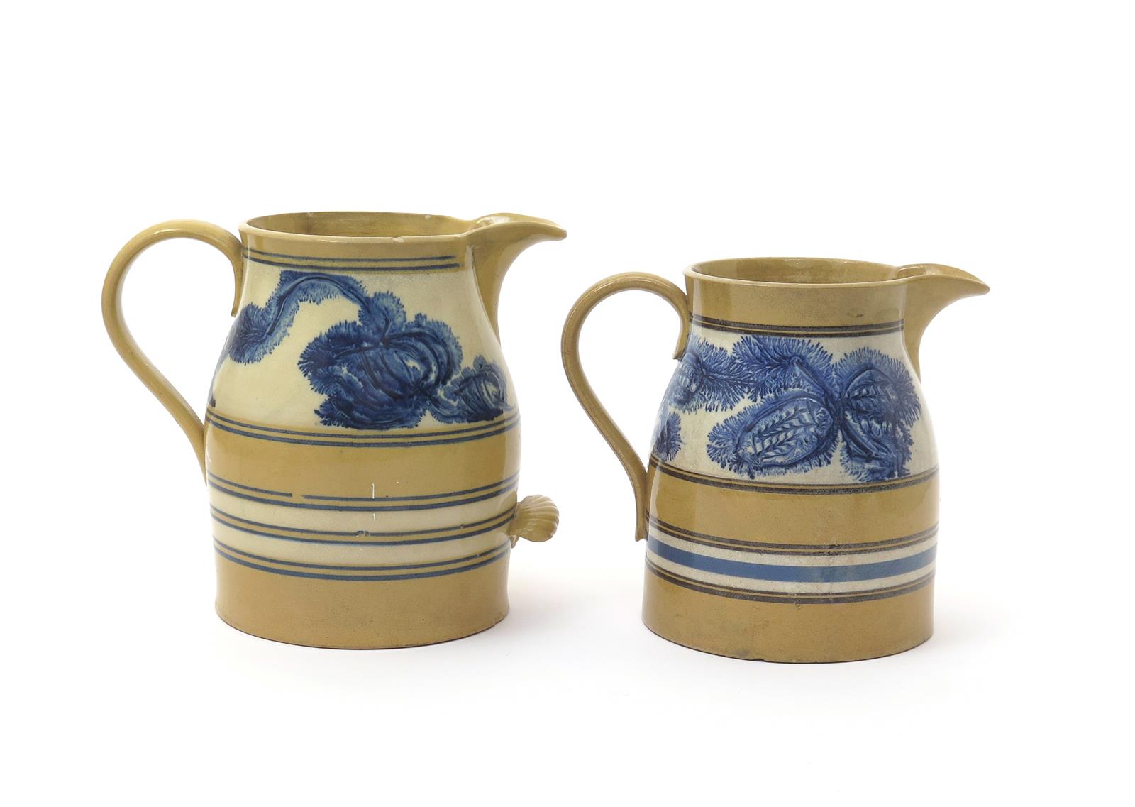 Two large Mochaware jugs 19th century, decorated with bands of stylized seaweed in blue on a white ground, above horizontal narrow bands in blue, white and brown on a buff ground, one cracked, 25.5cm max. (2)