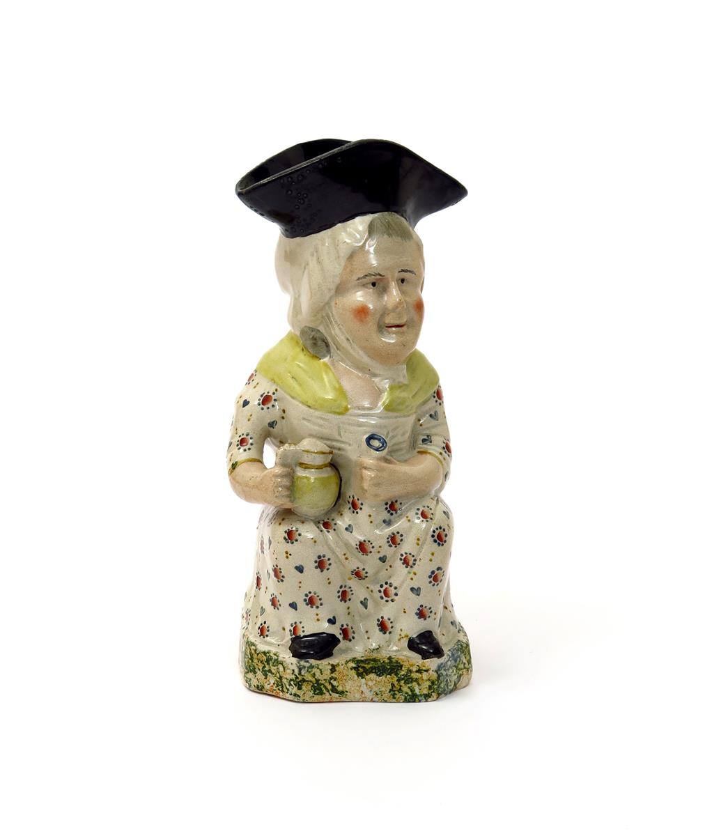 A Martha Gunn Toby jug c.1820-40, seated and holding a gin bottle and glass, her dress patterned with stylized flowerheads, raised on a base sponged in blue, green, red and ochre, 26cm.