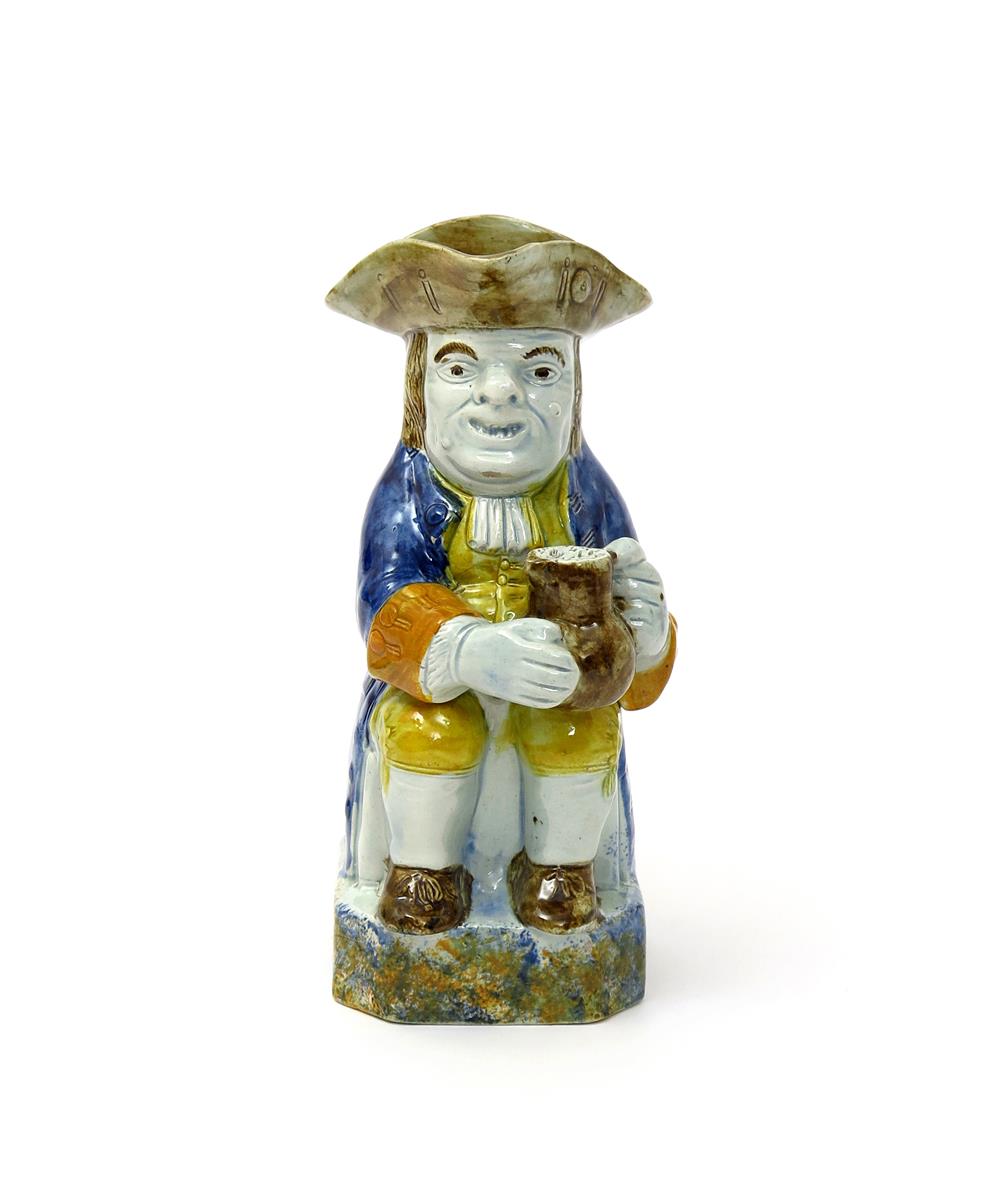 A Pratt ware Toby jug c.1790-1800, holding a frothing jug of ale and decorated in a typical palette of blue, brown, yellow and ochre, raised on an unusually tall base sponged in blue and ochre, a little good restoration to his hat, 24cm.
