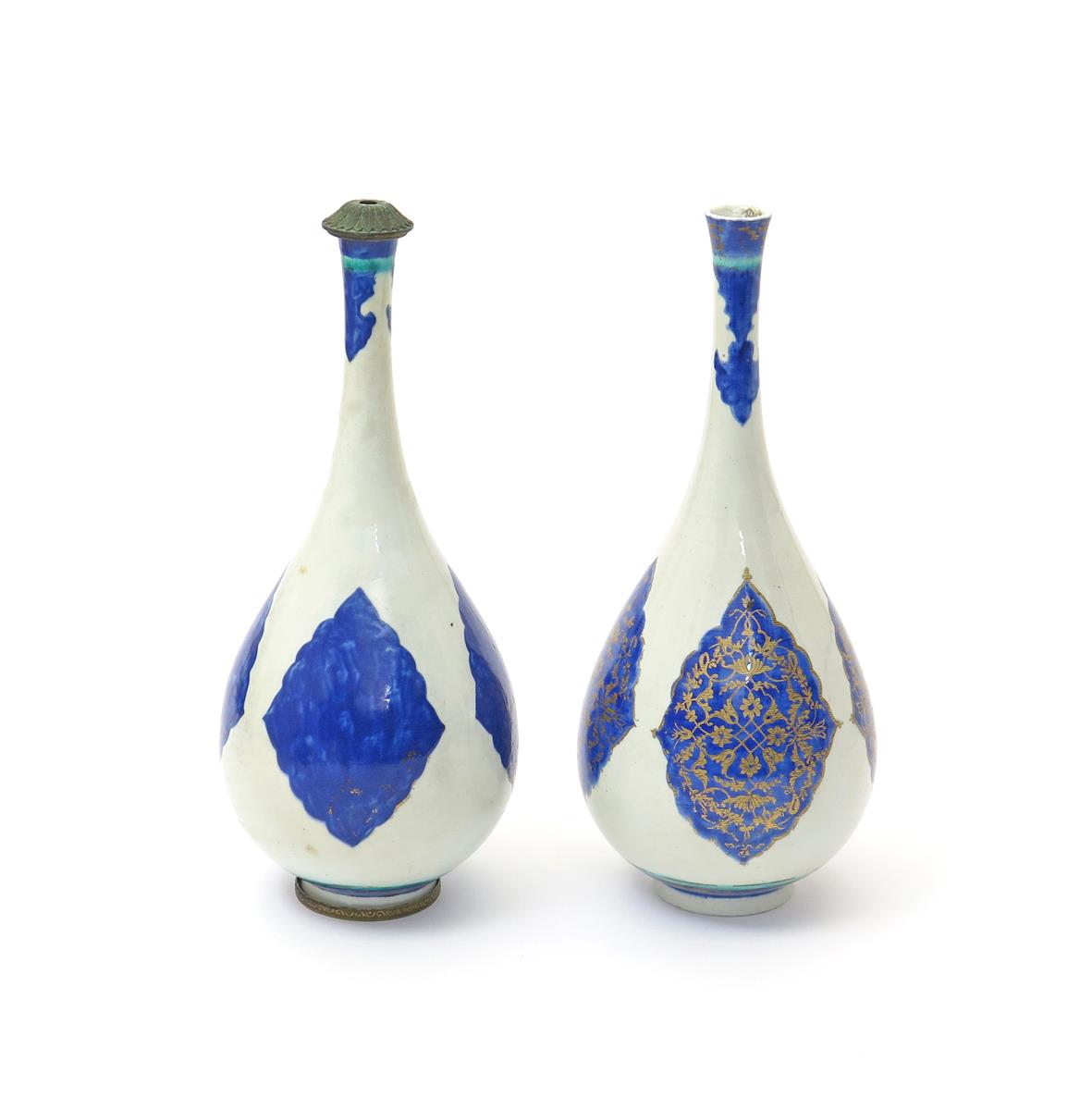 A pair of Samson Persian-style bottle vases late 19th century, each decorated with four shaped panels, with foliate gilt scroll designs, the necks with formal lappets and a narrow green band, the gilding heavily worn on one, both drilled, one with metal mounts, 38cm. (2)