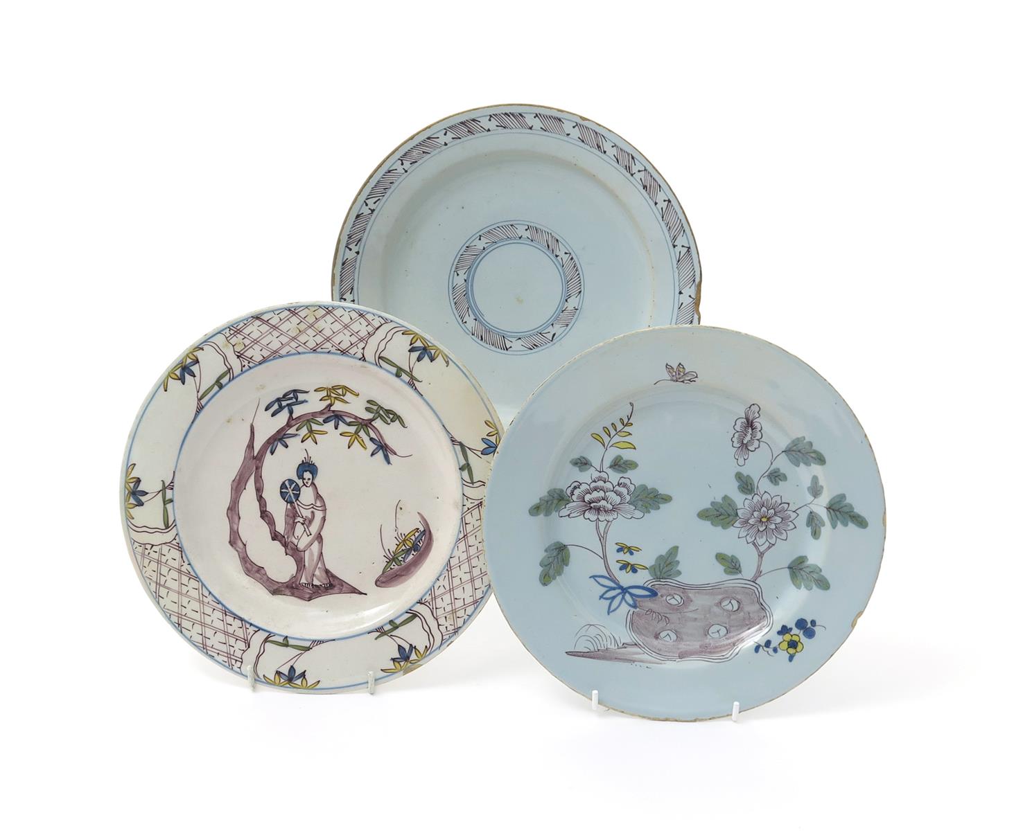 Three delftware plates c.1720-60, one painted in manganese, blue, green and yellow with a Chinese lady standing beneath bamboo and holding a fan, another in the same palette with flowering peony sprays issuing from holey rockwork, script h mark, the last with geometric manganese bands edged in blue, 22.8cm max. (3)