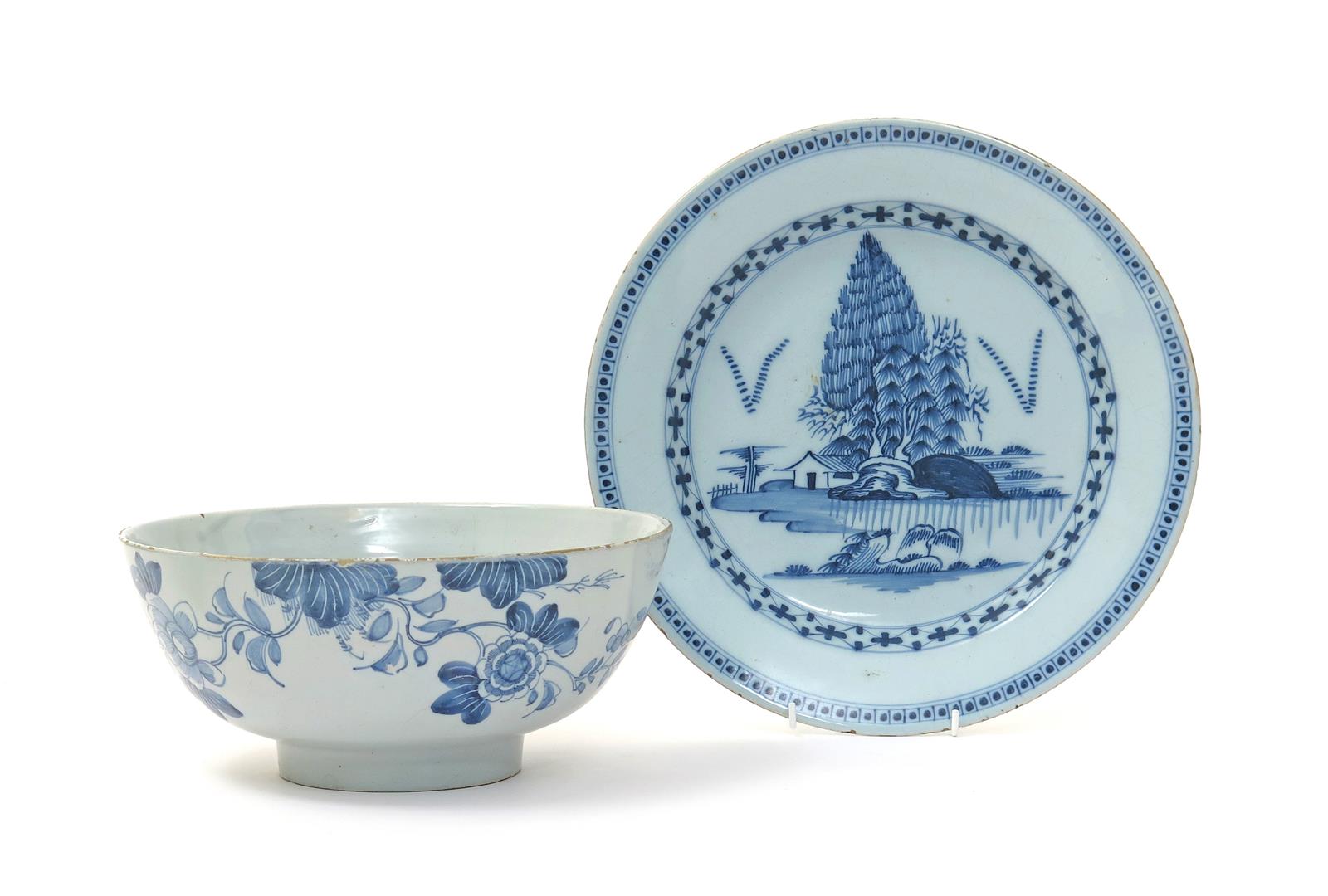 A Bristol delftware punchbowl and a Lambeth charger c.1760-70, the charger painted in blue with a low hut beneath tall pine trees, the cavetto with a trellis design, the bowl with a large spray of flowering peony, 30.6cm max. (2)