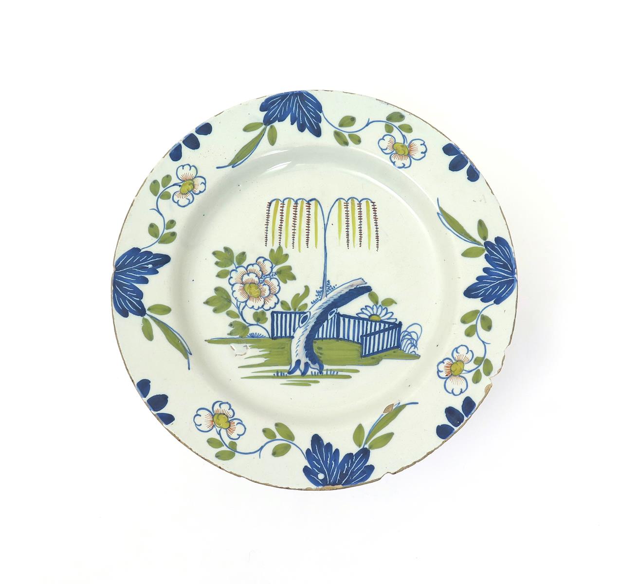 A large delftware charger mid 18th century, painted in blue, green, red and yellow with a weeping willow before a fence and flowering Oriental shrubs, the rim with three floral sprays, blue circle mark to the base, a little rim chipping, 36cm.