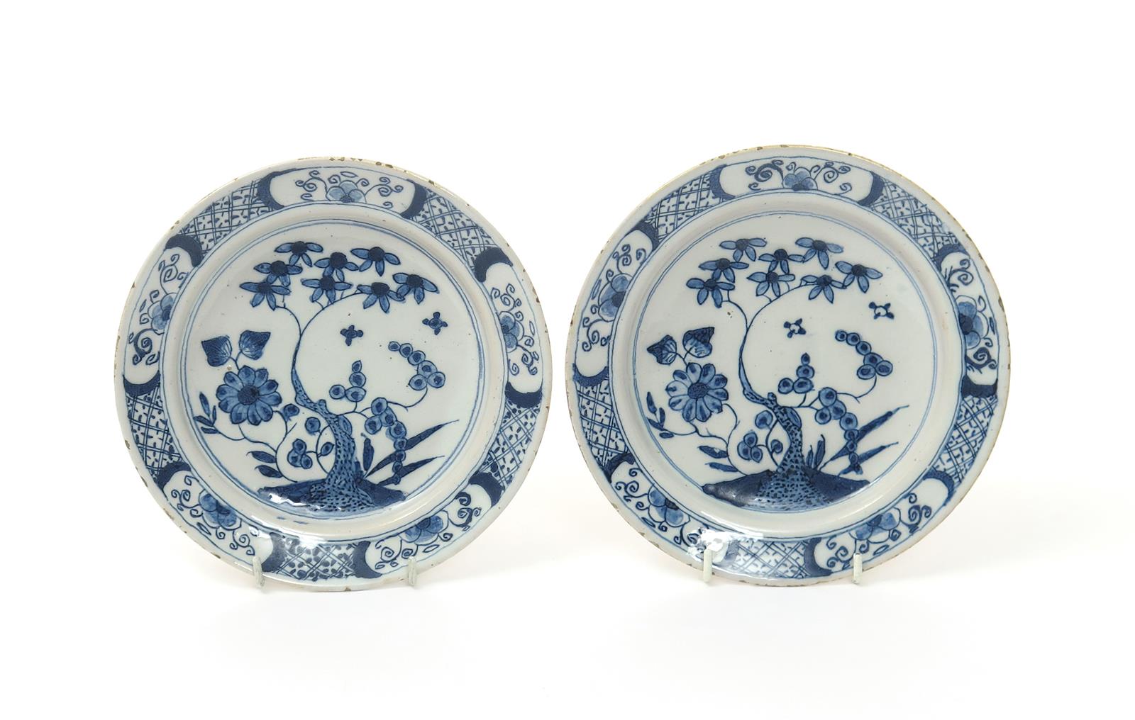 A small pair of delftware plates mid 18th century, painted in blue with a flowering tree, the rim with stylized flowering panels reserved on a trellis diaper ground, 19.8cm. (2)