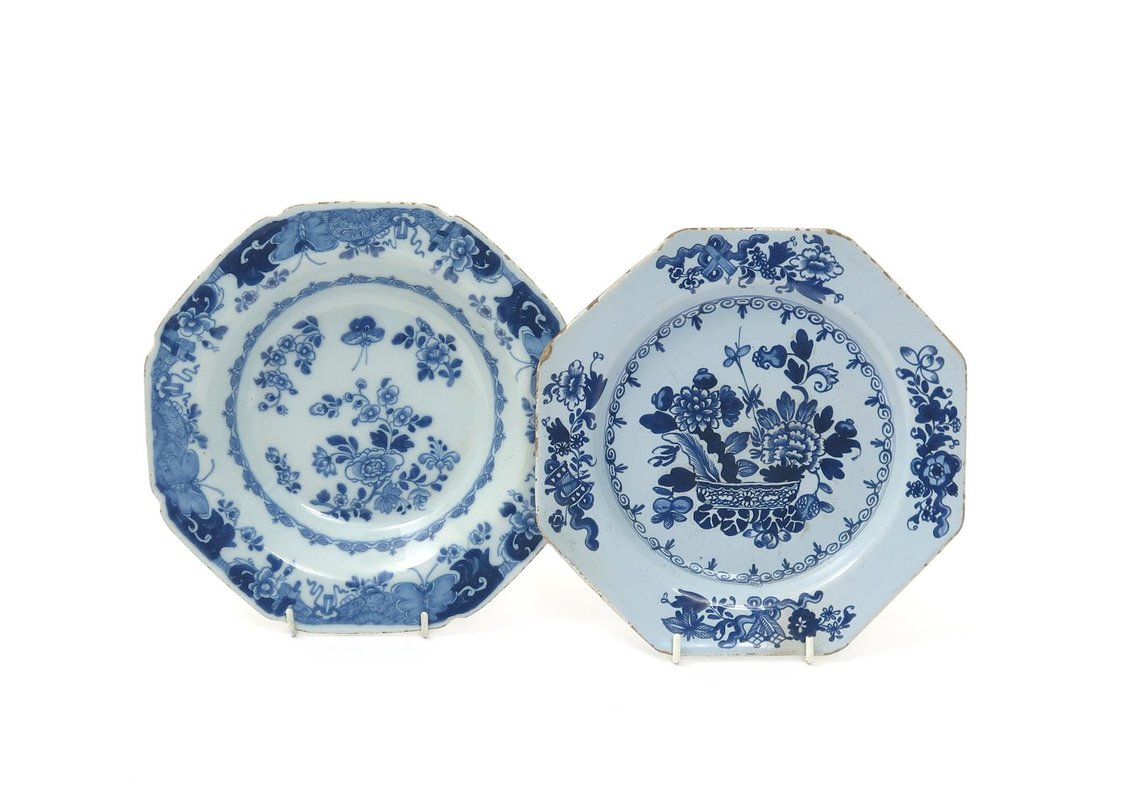 Two Irish delftware plates c.1760-70, one an octagonal soup plate painted with a butterfly above flowering plants, the rim with a Fitzhugh type border, numeral 2 mark, the other octagonal and painted with a censer containing flowering peony, the rim with four vignettes of tied scrolls and other auspicious objects, 23cm. (2)