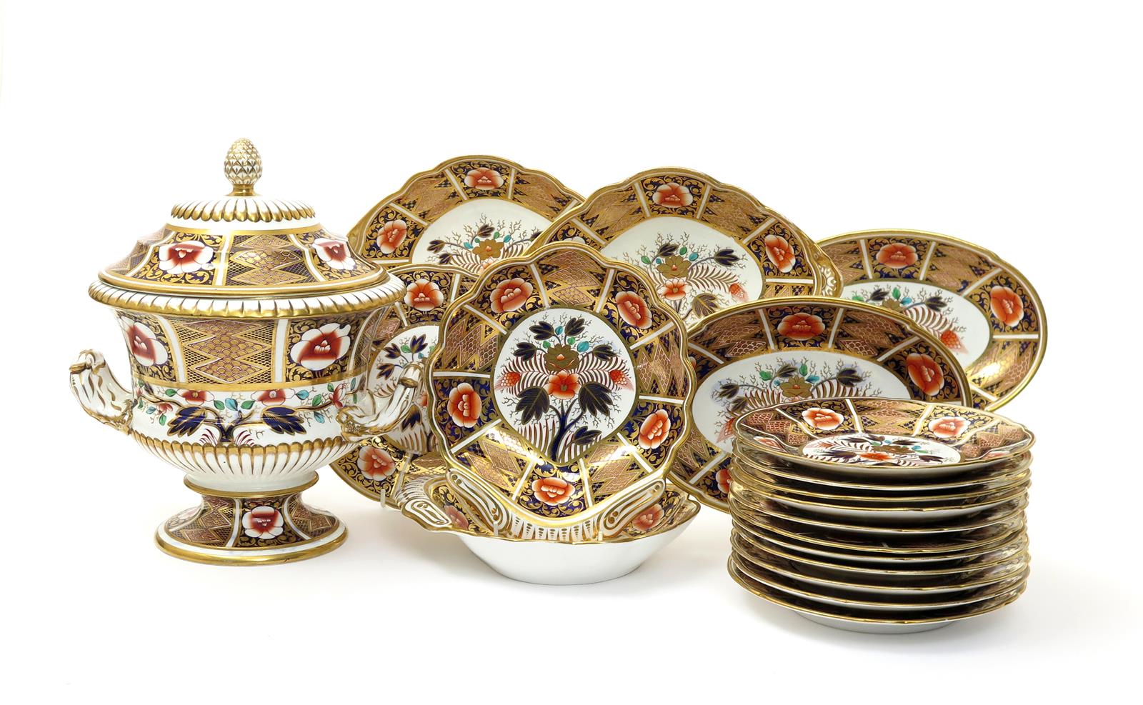 A good Spode part service c.1820, richly decorated in the Imari palette with stylized flowering plants within a panelled border, pattern number 1250. Comprising: an ice pail and cover, two shell-shaped dishes, two oval dishes, two handled dishes, and twelve plates. (20)