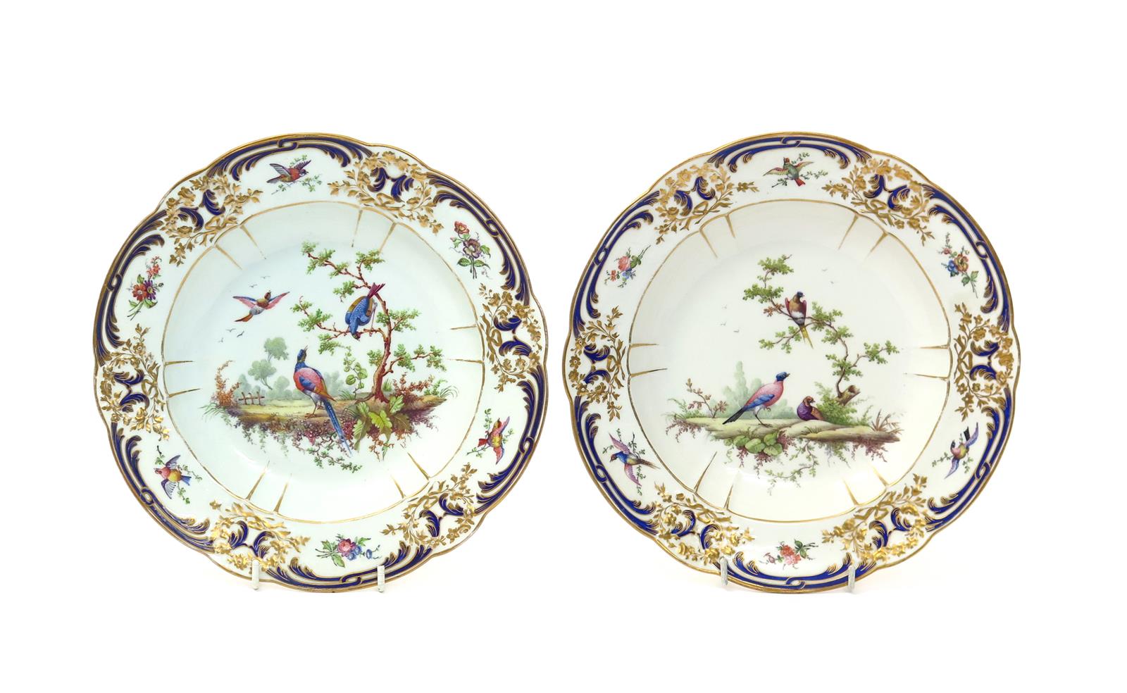 A pair of Nantgarw plates c.1818-20, London-decorated with colourful birds perched on and beneath leafy branches, the rims with small flower sprays and further birds in flight amidst moulded gilt flower wreaths and blue scrolls, spurious Sèvres marks, 25cm. (2)
