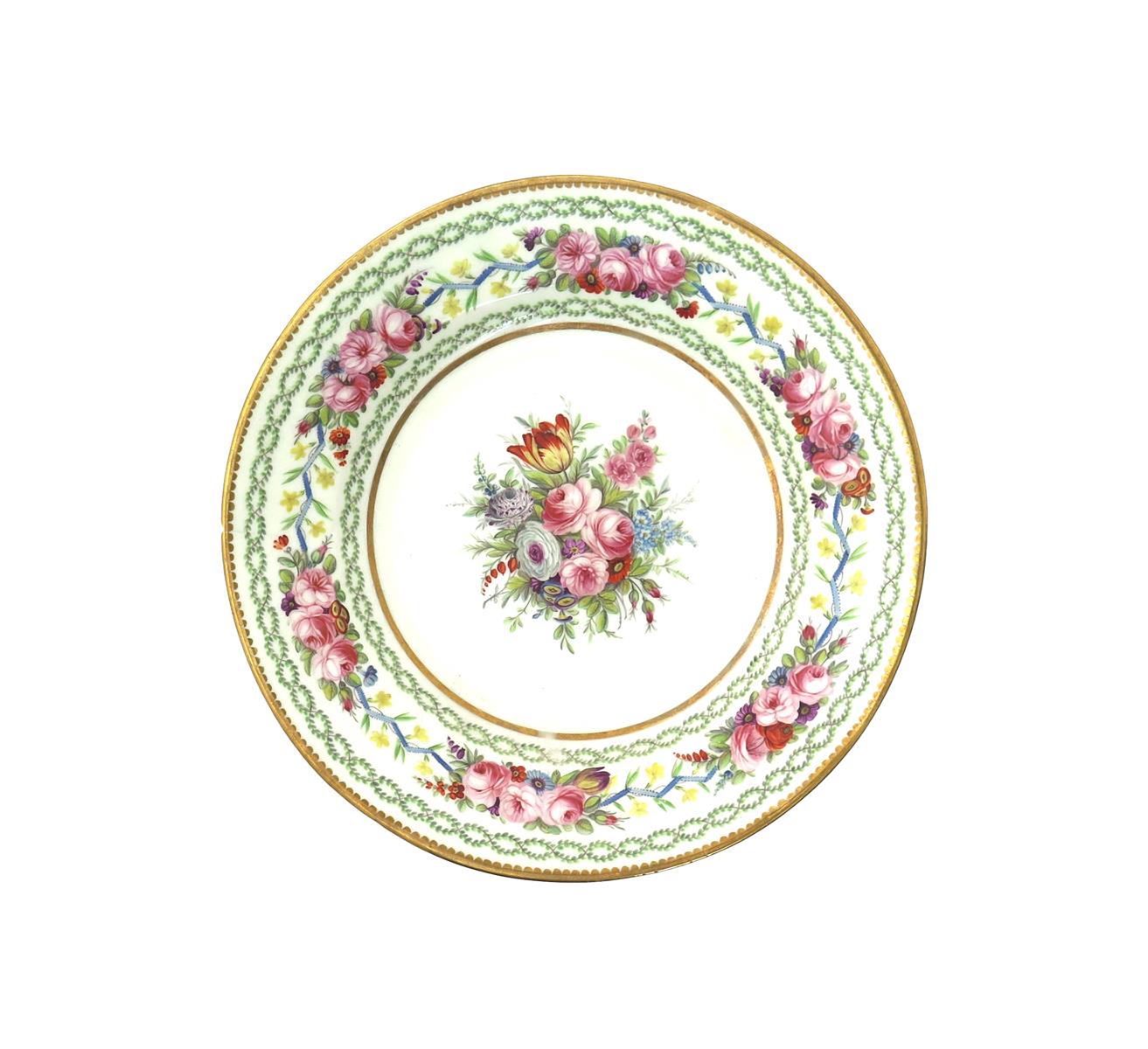 A Nantgarw plate c.1818-20, the well finely painted with a tight spray of flowers including rose, tulip and auricula, the rim with further flower sprays linked by a jagged blue ribbon between continuous leaf bands, impressed NANTGARW CW mark, 21.7cm.