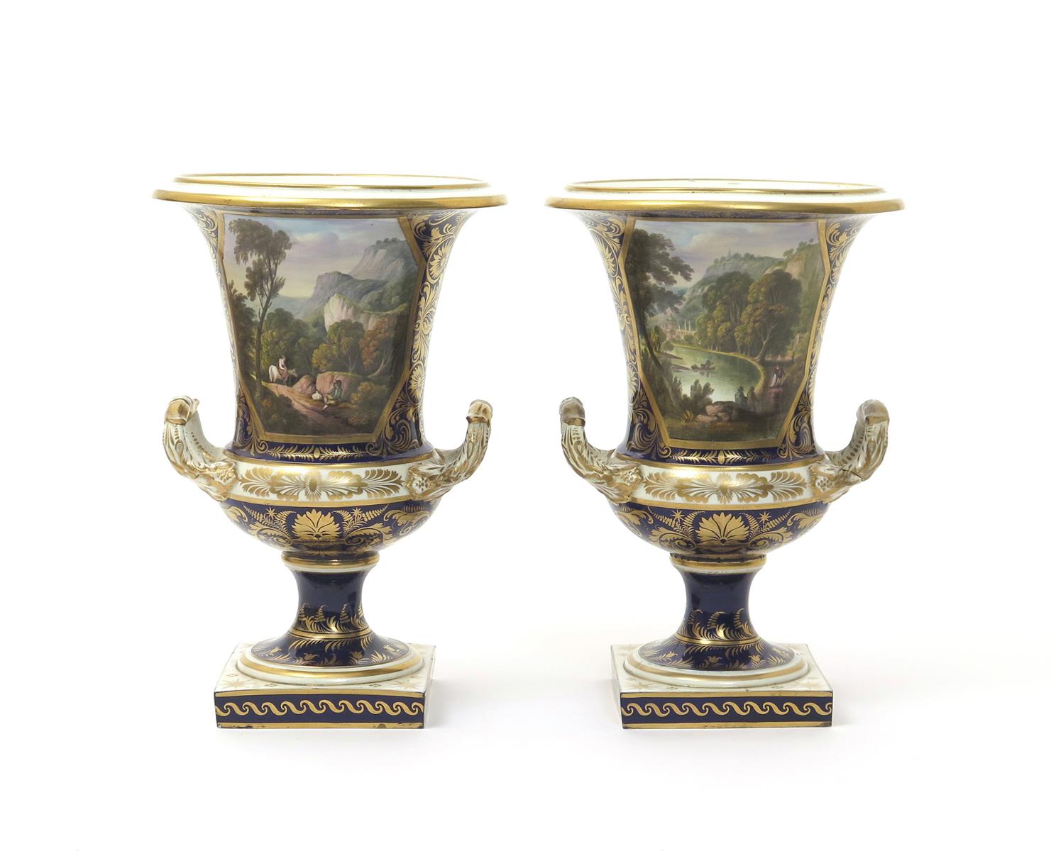 A large pair of Derby topographical vases c.1820, of campana shape, one painted with a scene of a weary traveller by the roadside in a mountainous landscape, the other with figures on and beside a lake, reserved in chamfered gilded panels on a deep blue ground, titled 'In Italy' to the underside, restoration to the handles of one vase, 33cm. (2)