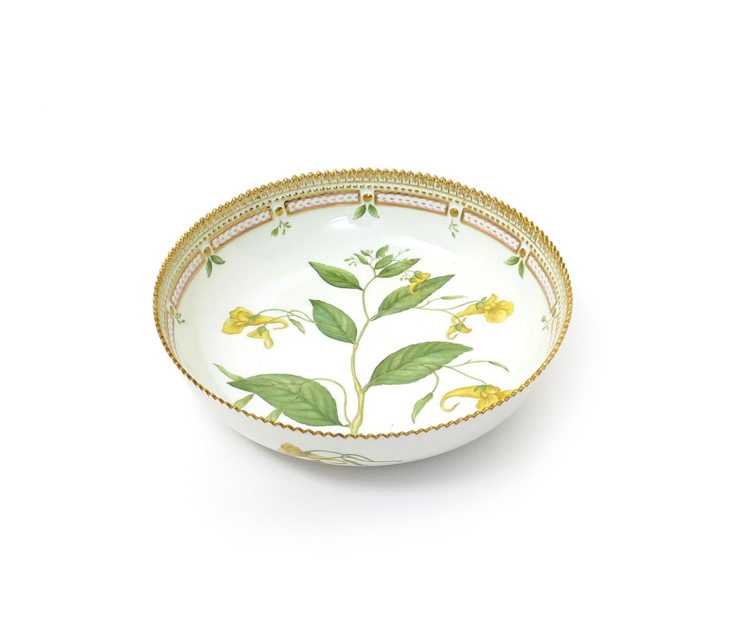A Royal Copenhagen Flora Danica dish 20th century, the deep circular form decorated to the well with a spray of impatiens, within a jagged gilded rim, titled to the underside 'Impatiens noli me tangere L.', 23.4cm.