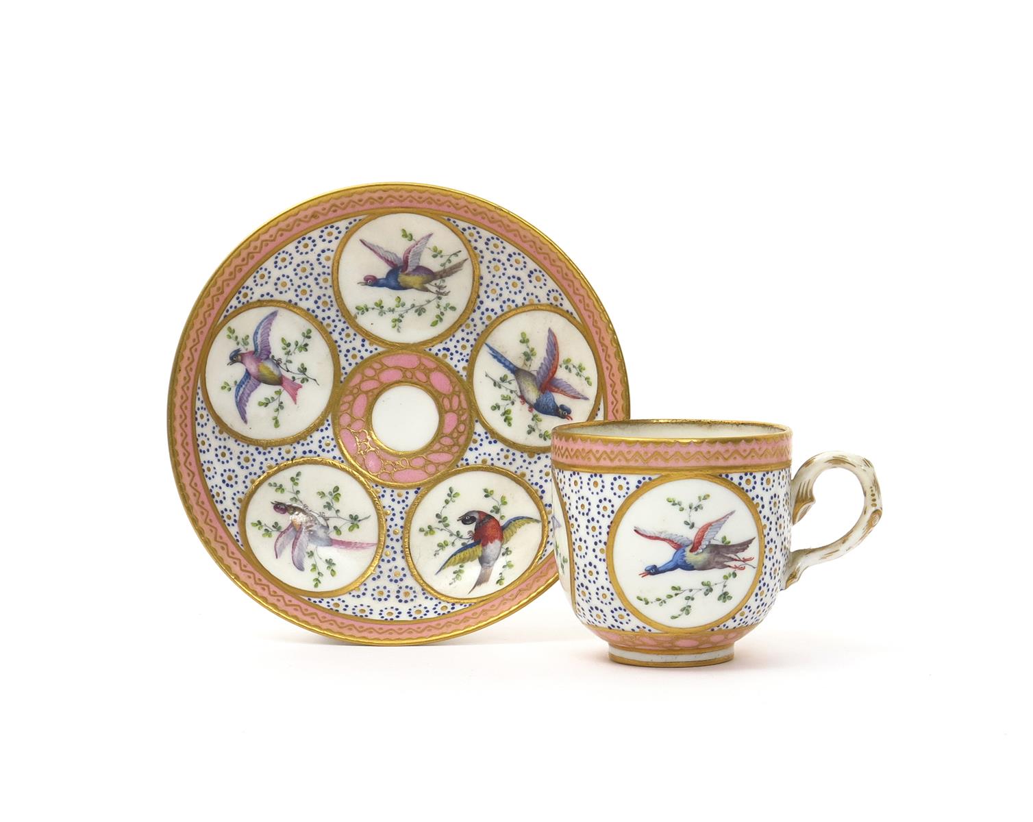 A Sèvres coffee cup and saucer c.1760-70, probably London-decorated with panels of exotic birds in flight reserved on an oeil de perdrix ground within pink and gilt borders, blue interlaced LL marks, 13.7cm. (2)