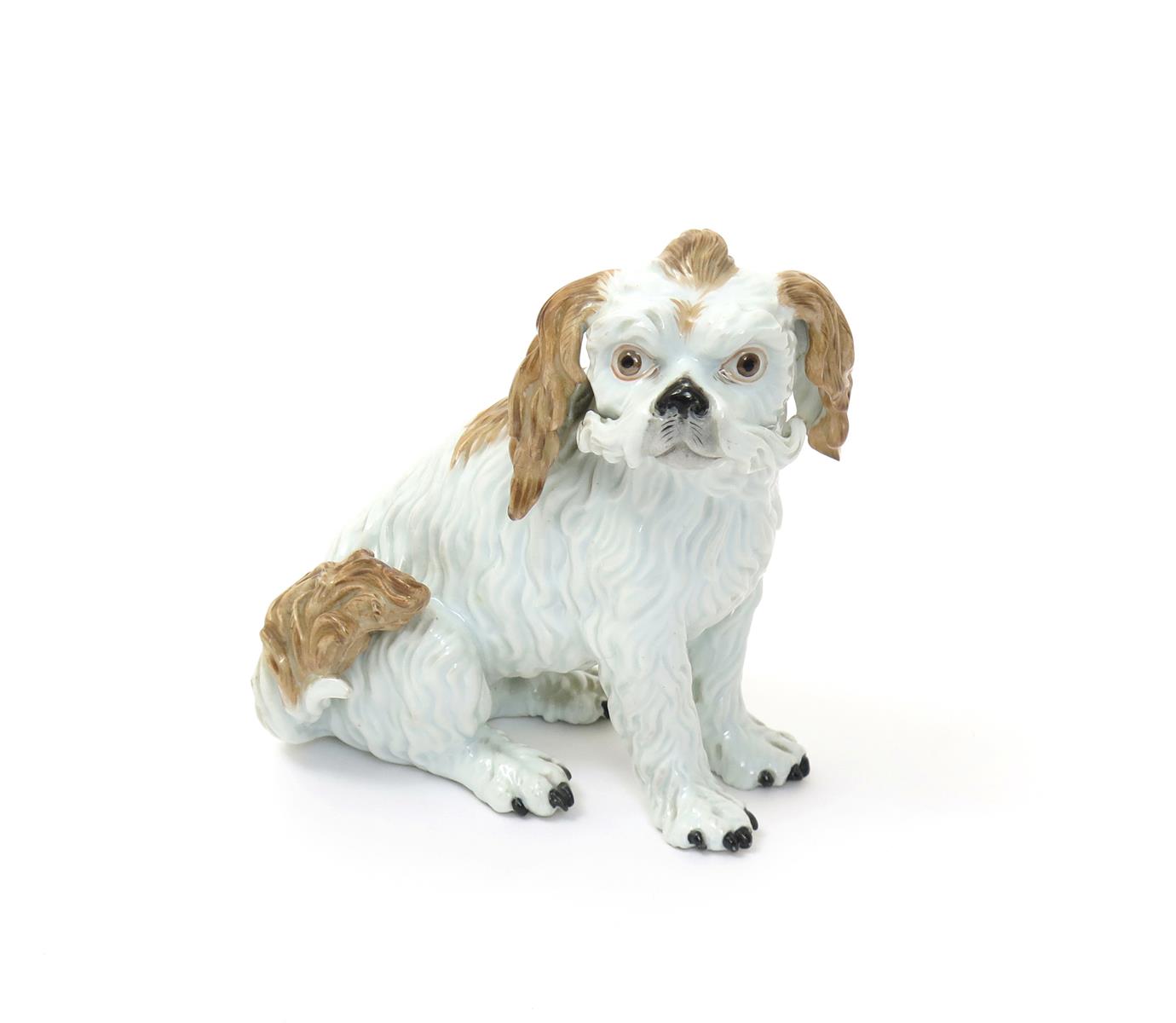 A Meissen figure of a Bolognese terrier 19th century, the small dog seated on its haunches with head turned to sinister, its long coat decorated with pale brown patches, blue crossed swords mark, incised C77, 15.3cm high.