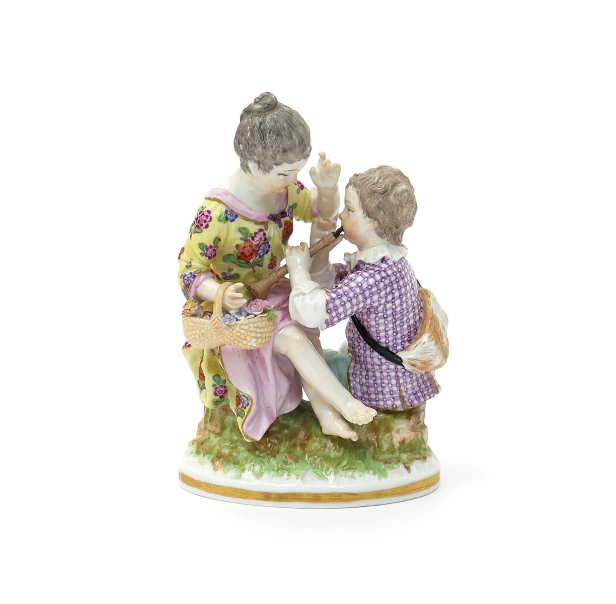 A Berlin figure group of children late 18th century, modelled with a boy playing the flageolet, the girl seated on a stump above him with a basket of flowers, raised on a grassy base, blue sceptre mark, 15.8cm.