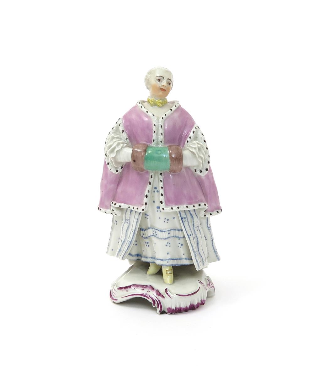 A Frankenthal figure of a lady c.1762-65, modelled by Johann Friedrich Lück, standing gazing slightly upwards, her blue and white dress below a puce cape trimmed in ermine, her hands inside a fur-lined muff, raised on a shaped base moulded with scrolls picked out in puce, blue CT and crown mark, incised workman's marks AB, R and numerals (tiny chips to the hem of her gown and lace sleeves)