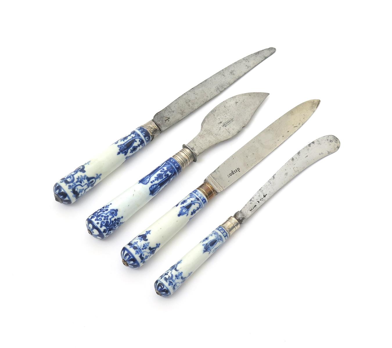 Four St Cloud knife handles c.1720, the cannon hafts painted in blue with lambrequin designs, one a fish knife with the blade marked for Alain fils du Commercial, Nevers, two with restoration, 25.5cm overall max. (4)