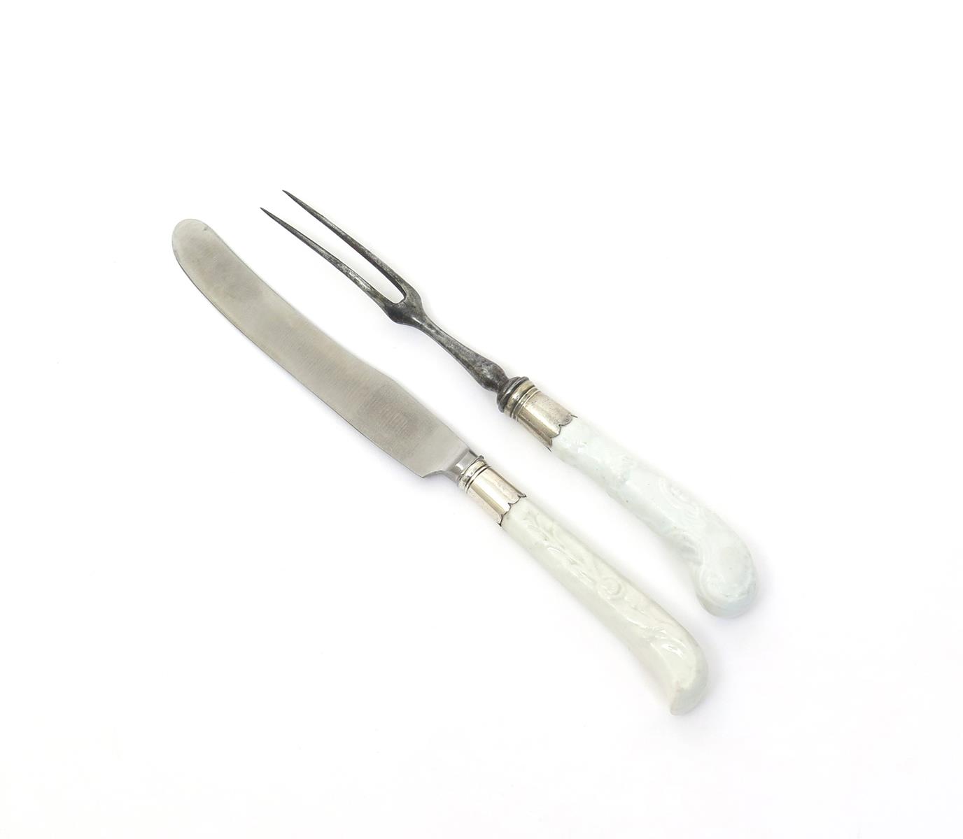 A Chelsea white-glazed knife handle and a Bow fork c.1752-55, the knife with a faceted pistol haft moulded with flowering branches, the two-pronged fork with formal scrolls and a band of leaves, 20cm overall max. (2)
