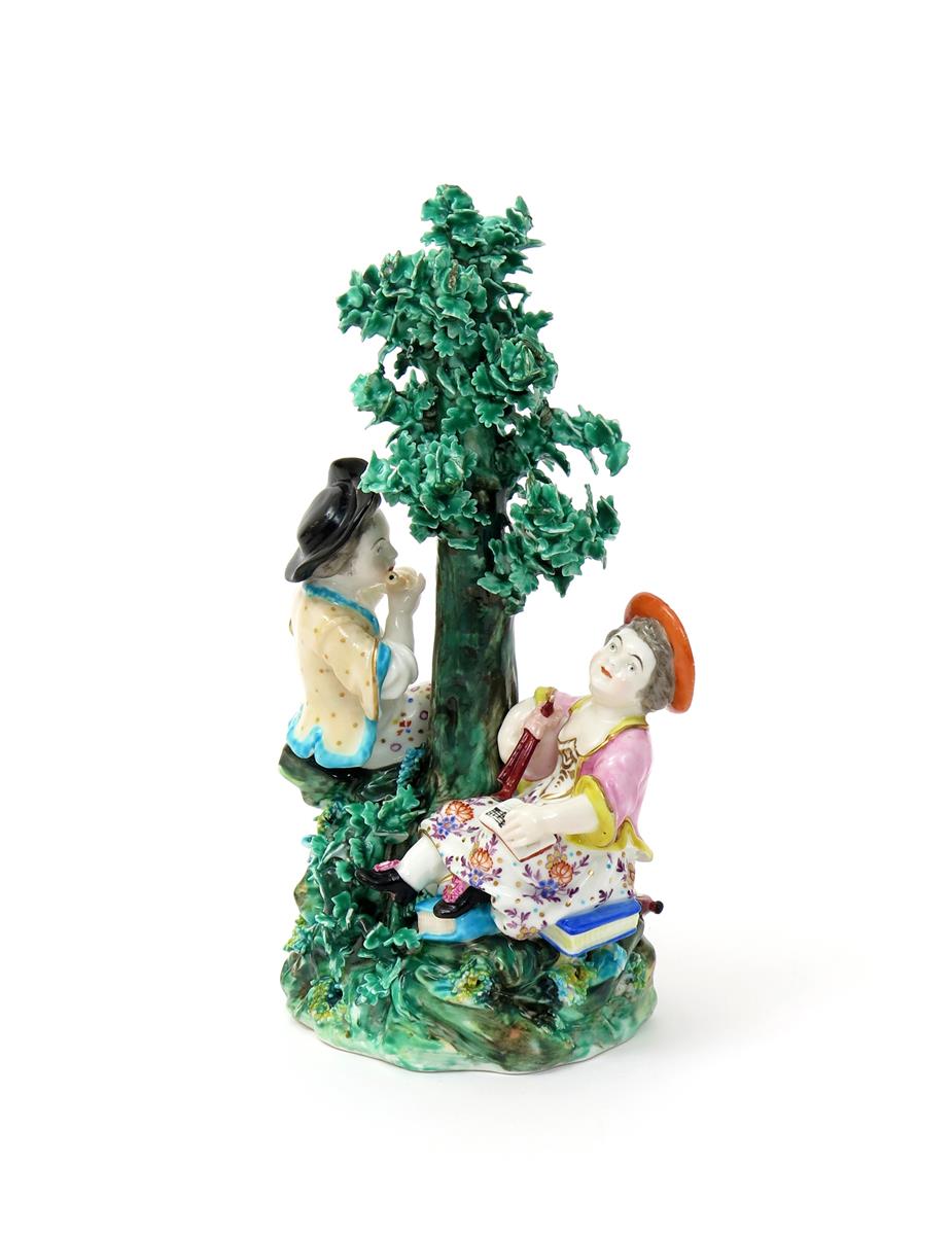 A Derby figure group of Music c.1775-80, of two children seated around a tree, he playing the flute, she with the bagpipes and holding a musical score on her knee, raised on a rocky base, incised No.139 to the base, minor losses, 23.2cm.