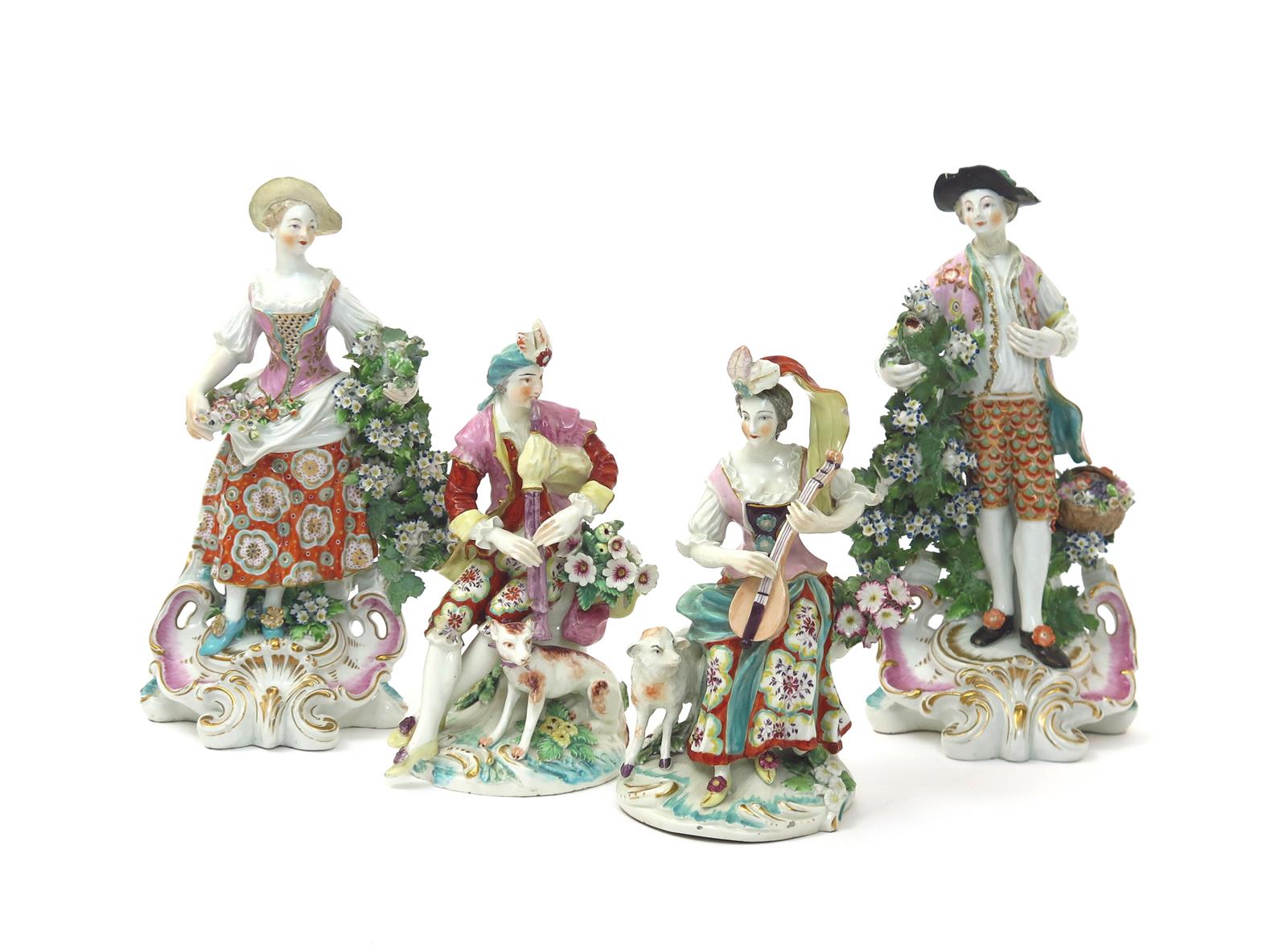 Two pairs of Derby figures c.1760-65, one pair of seated musicians, he playing the bagpipes and she the mandolin, the other pair of gardeners, he with a basket of flowers, she with further blooms in her apron, each standing beside flowering bocage, all raised on scrolled bases, some damages, 26.5cm max. (4)