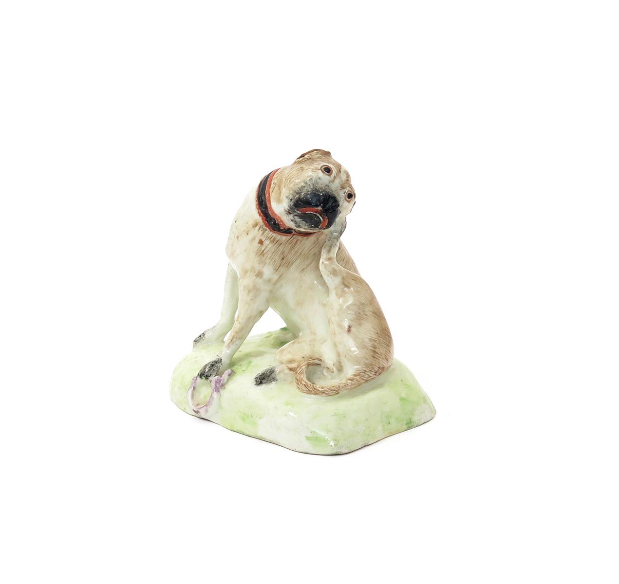 A rare Bow model of a pug dog c.1755, seated on a low grassy mound and scratching his left ear with his left rear paw, one forepaw resting on a toy, decorated in polychrome enamels, a small chip to the base, 11cm.