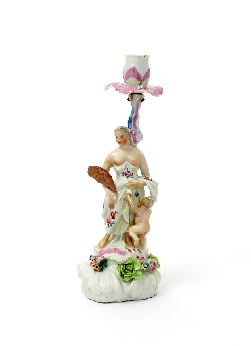A Longton Hall candlestick figure of Ceres c.1758, standing on a rocky base and holding a sheaf of corn in her right hand, a putto standing beside her, the sconce and drip pan supported on a slender stem highlighted in pink and blue enamels, some chips to the flowers, a little restoration to the putto's arm, 29.8cm.