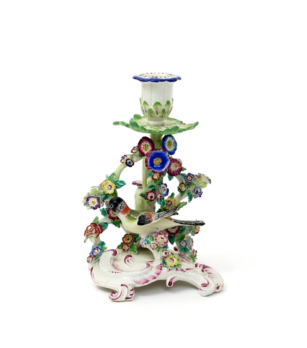 A Bow candlestick bird group c.1765, modelled with a single finch perched on a low flowering branch and pecking at a further bloom, raised on a scrolled base picked out in puce, some restoration to the base and branches, 19cm.