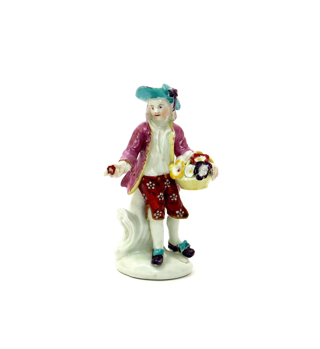 A small Derby figure of a flower seller c.1756, standing on a low pad base and carrying a basket of flowers over his left arm, a single bloom in his right hand, some restoration to his right arm and coat tails, 11.8cm.